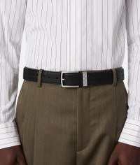 Product Details - Intrecciato piccolo calfskin leather belt - Metal buckle and Intreccio engraved loop - Prong closure - Lining: Calf leather - Color: Black - Hardware: Silver finish - Made in: Italy - Product code: 843902V5XN18803 Material - Material: Calfskin Size & Fit - Height: 3.5 cm | 1.4" - Depth: 0.5 cm | 0.2"