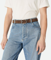 Belt in soft Intrecciato suede with rounded buckle. Product Details - Intrecciato suede belt - Metal round buckle - Prong closure - Material: Calfskin - Lining: Calf leather - Color: Fondant - Hardware: Silver finish - Height: 3.5 cm | 1.4" - Depth: 0.5 cm | 0.2" - Made in: Italy - Product code: 837520V1QE12145