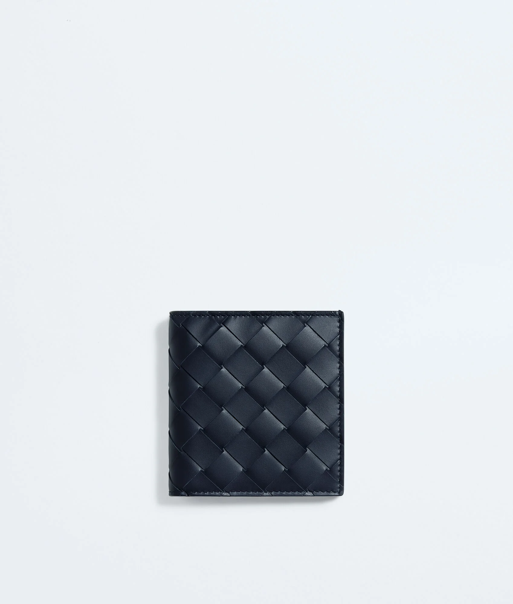 Slim bi-fold wallet in Intrecciato calf leather with contrasted interior. Product Details - Intrecciato two-tone calfskin leather wallet - Six card slots, one note compartment, two additional pockets - Color: Midnight/Basalt - Lining: Calfskin - Made in: Italy - Product code: 749400VCPQ64364 Material - Material: calfskin Size & Fit - Height: 10 cm | 3.9" - Width: 9.5 cm | 3.7" - Depth: 1 cm | 0.4"