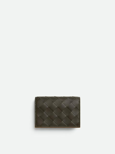 Intrecciato calfskin leather card case with contrasted interior. Product Details - One compartment, one card slot, one back pocket - Material: calfskin - Lining: Calfskin - Color: Shadow/Olive Oil - Height: 7.5 cm | 3" - Width: 11 cm | 4.3" - Depth: 2.5 cm | 1” - Made in: Italy - Product code: 605720VCPQA4229