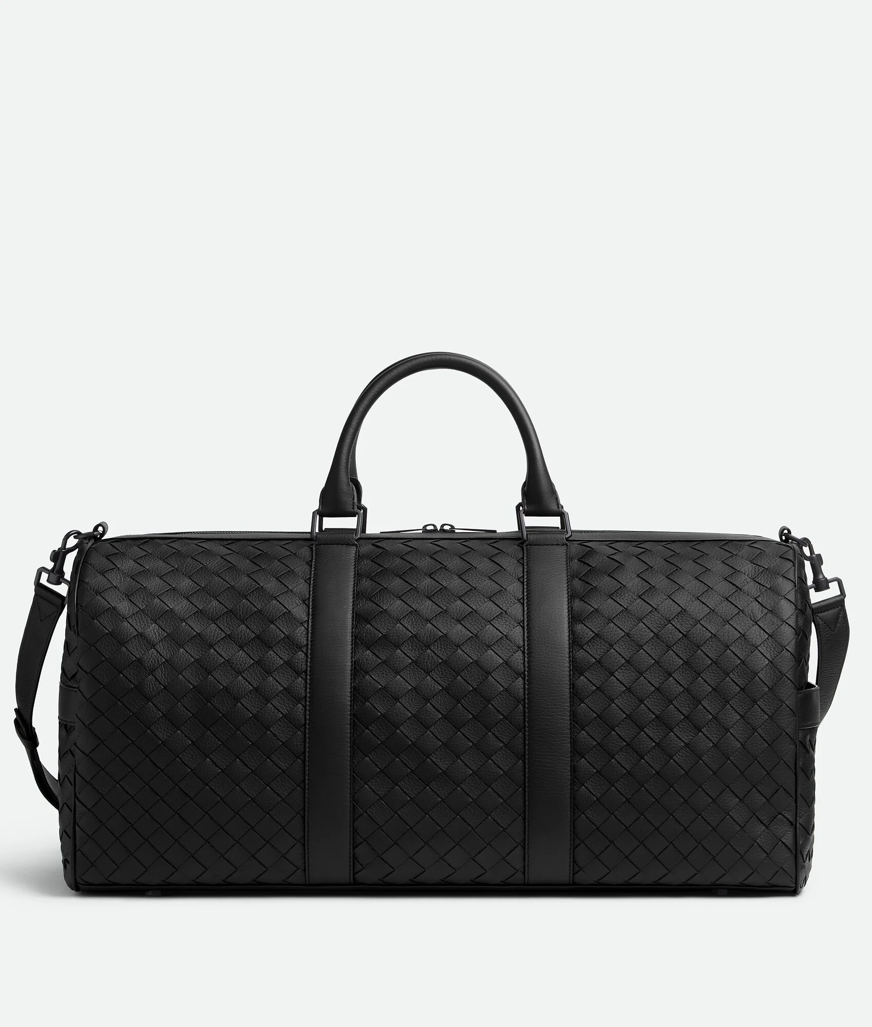 Duffle bag in Intrecciato deer leather with adjustable and detachable strap. Product Details - Intrecciato deerskin leather duffle bag with adjustable and detachable strap - Single exterior side zipped pocket - One interior zipped pocket, double flat open pockets - Zip closure - Lining: Suede - Color: Black - Hardware: Matte Black finish - Made in: Italy - Product code: 795287V5WN48966 Material - Material: Deer leather Size & Fit - Height: 29 cm (11.4") - Width: 55 cm (21.7") - Depth: 24 cm (9.4") - Handle drop: 15 cm (5.9") - Strap drop: 53 cm (20.9") - Fits a 16" laptop