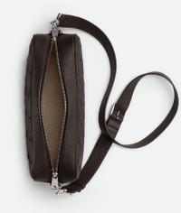 Cross-body bag in Intrecciato grained leather with detachable strap and metal D-ring. Product Details - Intrecciato grained leather cross-body bag with detachable strap and metal D-ring - One interior zipped pocket with leather trimming, one open pocket in canvas - Zip closure - Material: calfskin - Lining: Canvas - Color: Fondant - Hardware: Silver finish - Height: 19.5 cm | 7.7” - Width: 29 cm | 11.4” - Depth: 7.5 cm | 2.9” - Strap drop: 55 cm | 21.7” - Made in: Italy - Product code: 755925V4G312145