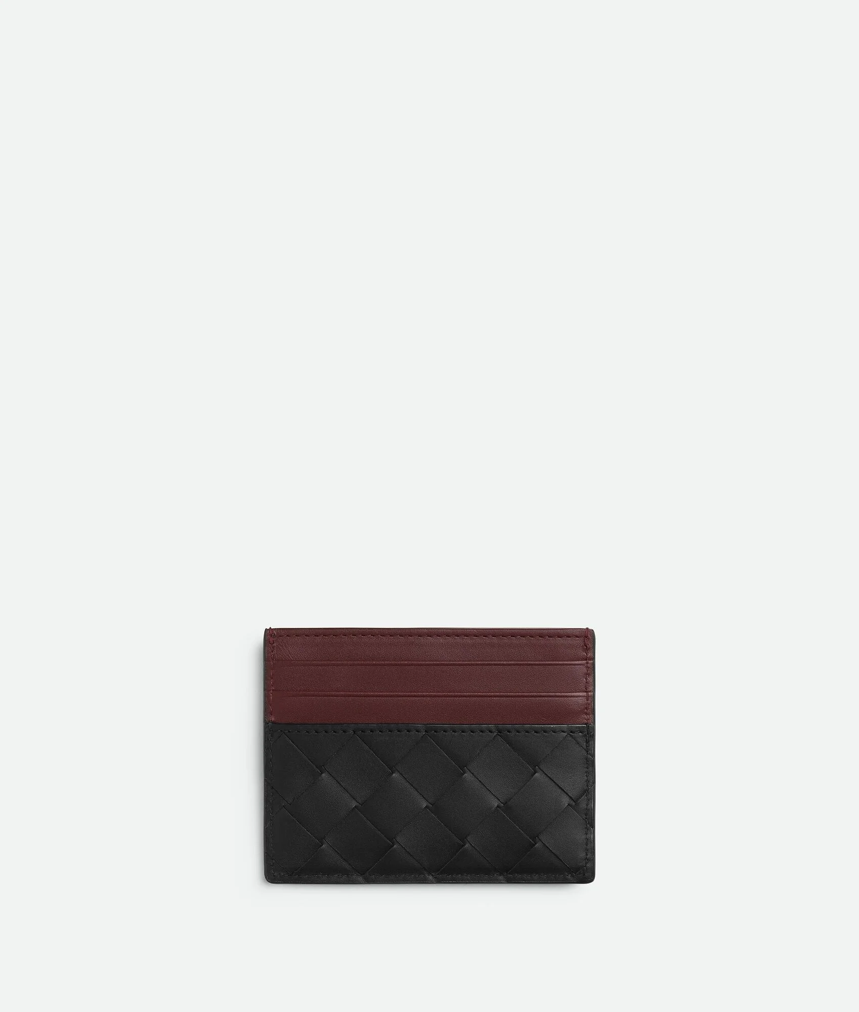 Intrecciato calfskin leather card case with contrasted interior. Product Details - Six card slots, one central pocket - Material: calfskin - Lining: Calfskin - Color: Black/Madder Brown - Height: 8 cm | 3.1” - Width: 10.5 cm | 4.1” - Depth: 0.5 cm | 0.2” - Made in: Italy - Product code: 795612VCPQ51226