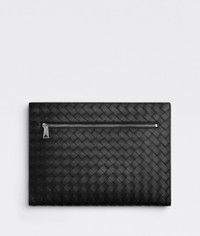 Product Details - Medium intrecciato leather briefcase - Single exterior zippered pocket - Six interior card slots, Single open pocket, two compartments - Zipper closure - Material: calfskin - Lining: Bonded suede - Color: Black - Hardware: Silver finish - Height: 27 cm | 8.1" - Width: 37 cm | 14.6" - Depth: 2.5 cm | 1" - Made in: Italy - Product code: 693708V0E508803