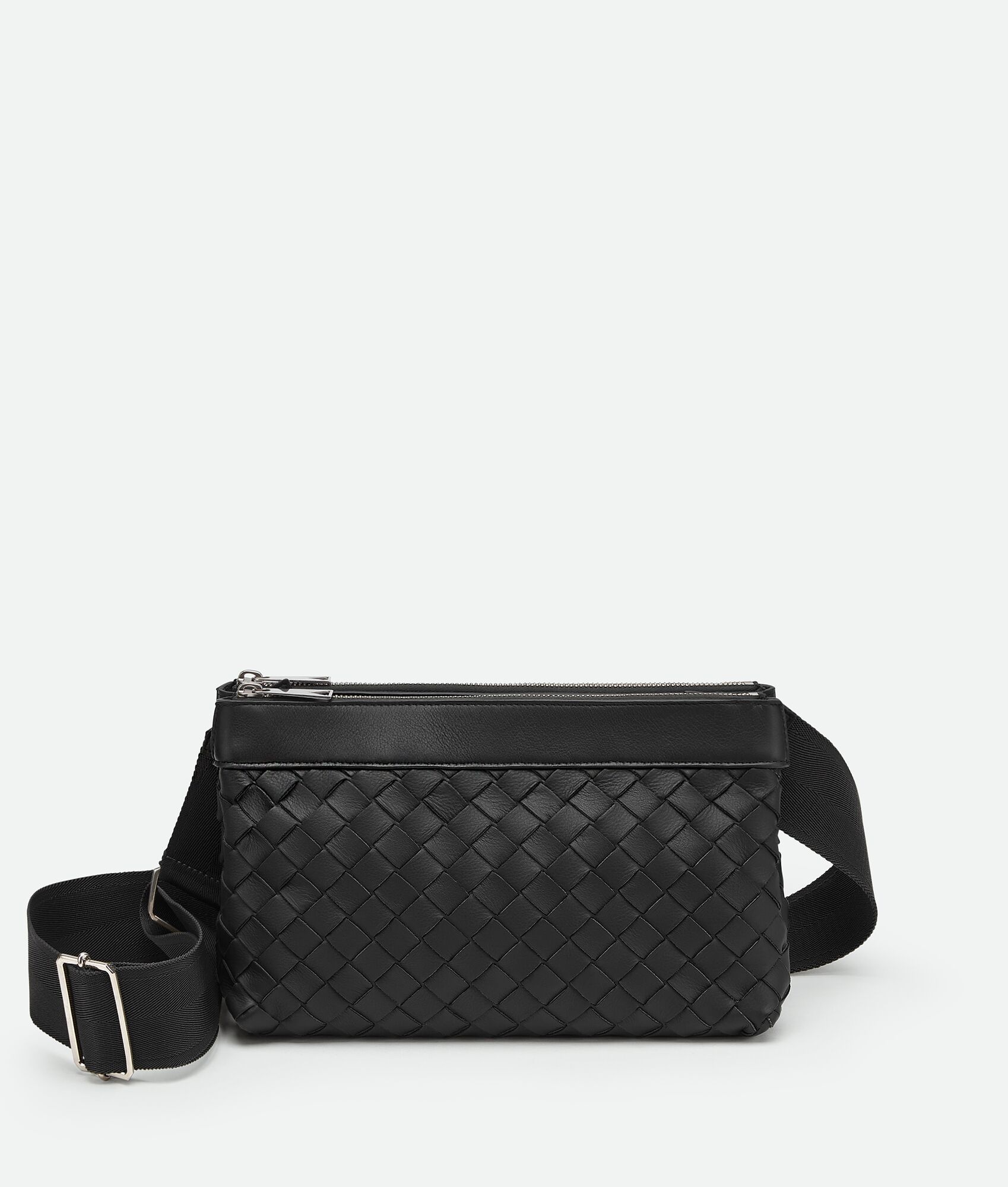 Intrecciato leather crossbody bag. Product details • Intrecciato leather crossbody bag • Two pouches snapped together • Zipper closure Material: 50% Lamb Skin, 50% Calf Skin • Lining: Bonded suede • Color: Black • Hardware: Silver finish • Height: 16 cm | 6.3" • Width: 26 cm | 10.2" • Depth: 9 cm | 3.5" • Strap drop: 60 cm | 23.6" Made in: Italy