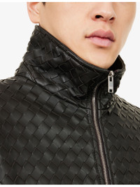 PRODUCT DETAILS - Bottega Veneta leather jacket - 100% leather; lining 100% cotton - Zip fastening - Relaxed fit, funnel neck, long sleeves, welt pockets at front, ribbed trims, two-way zip, all-over intrecciato leather, fully lined - Specialist leather clean - Made in Italy - Size UK40: chest 49in / 124.5cm, length 25in / 63.5cm - Model is 6ft 2in/1.88m and wears a size UK 40 - Heavyweight, non-stretch Ref: R04602139