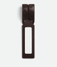 Intrecciato calfskin leather tag holder. Product details • Window to display paper tag • Paper tag inside for name and address Material: 100% Calfskin • Lining: Calfskin • Color: Fondant • Height: 4.5 cm | 1.8" • Width: 31.5 cm | 12.4" • Depth: 0.5 cm | 0.2" Made in: Italy