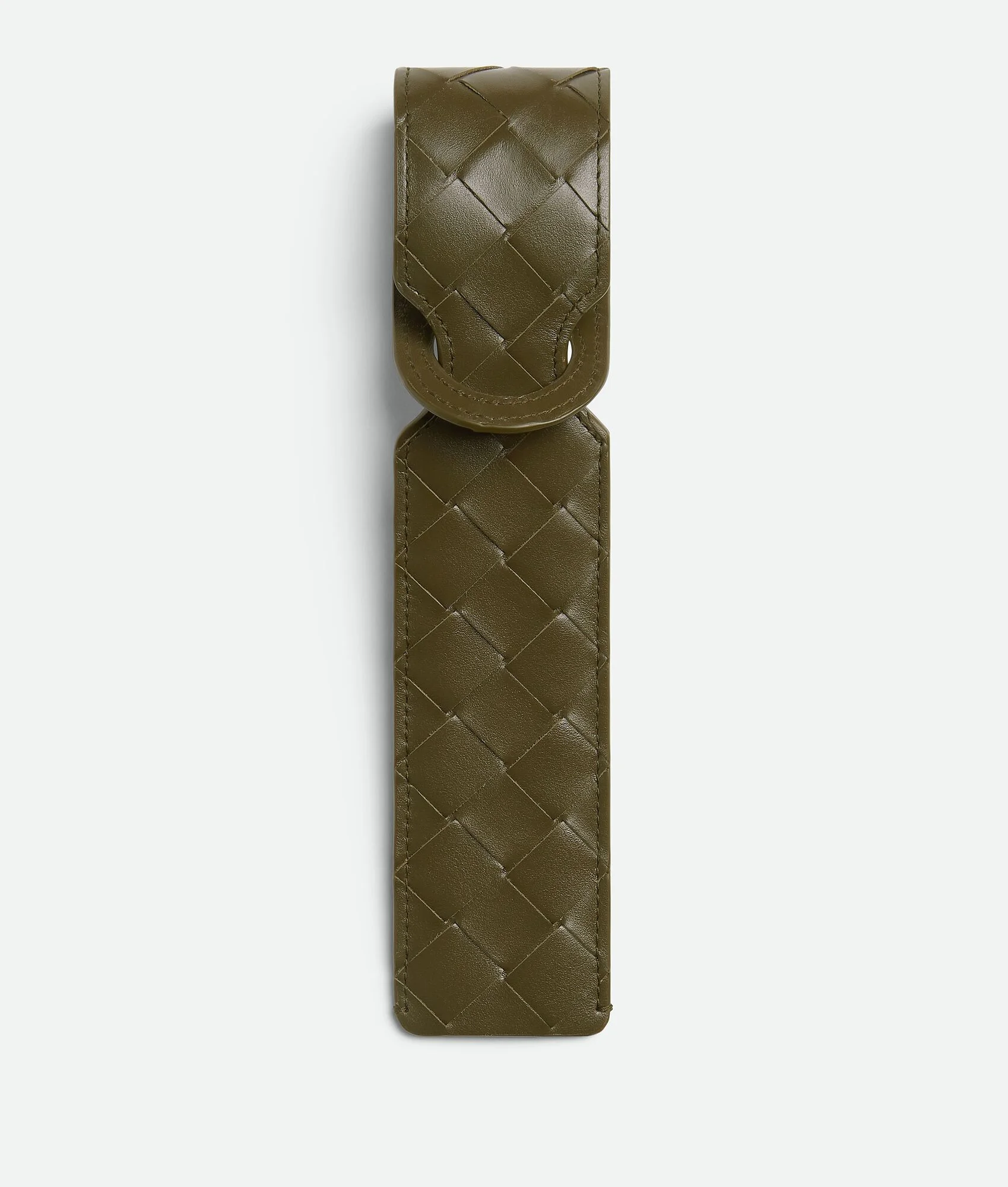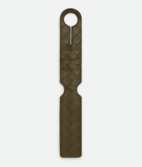 Intrecciato calfskin leather tag holder. Product Details - Window to display paper tag - Paper tag inside for name and address - Material: calfskin - Lining: Calfskin - Color: Mustard - Height: 4.5 cm | 1.8" - Width: 31.5 cm | 12.4" - Depth: 0.5 cm | 0.2" - Made in: Italy - Product code: 786628V2HL12328