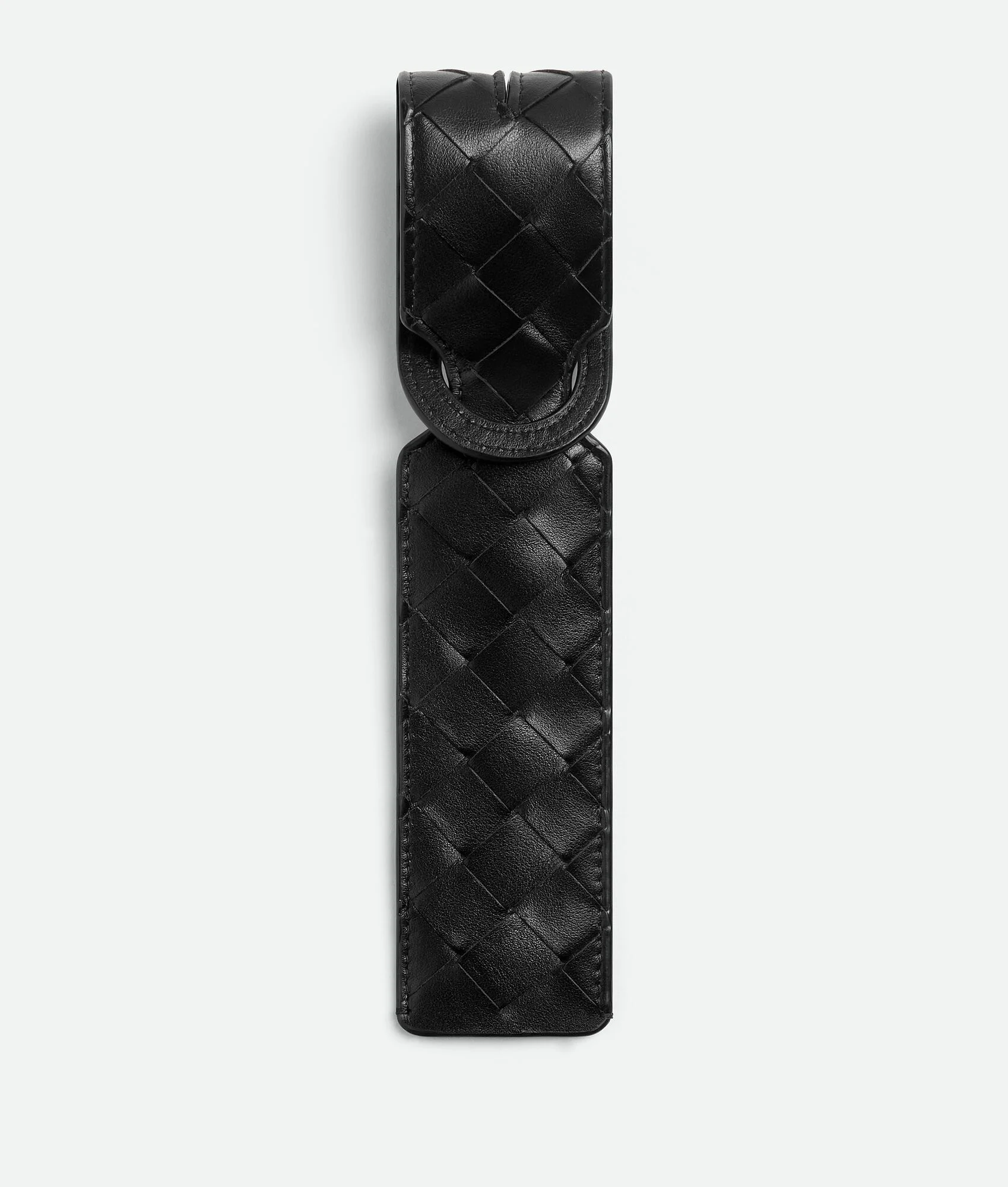 Intrecciato calfskin leather tag holder. Product Details - Window to display paper tag - Paper tag inside for name and address - Material: calfskin - Lining: Calfskin - Color: Black - Height: 4.5 cm | 1.8" - Width: 31.5 cm | 12.4" - Depth: 0.5 cm | 0.2" - Made in: Italy - Product code: 786628V2HL11000