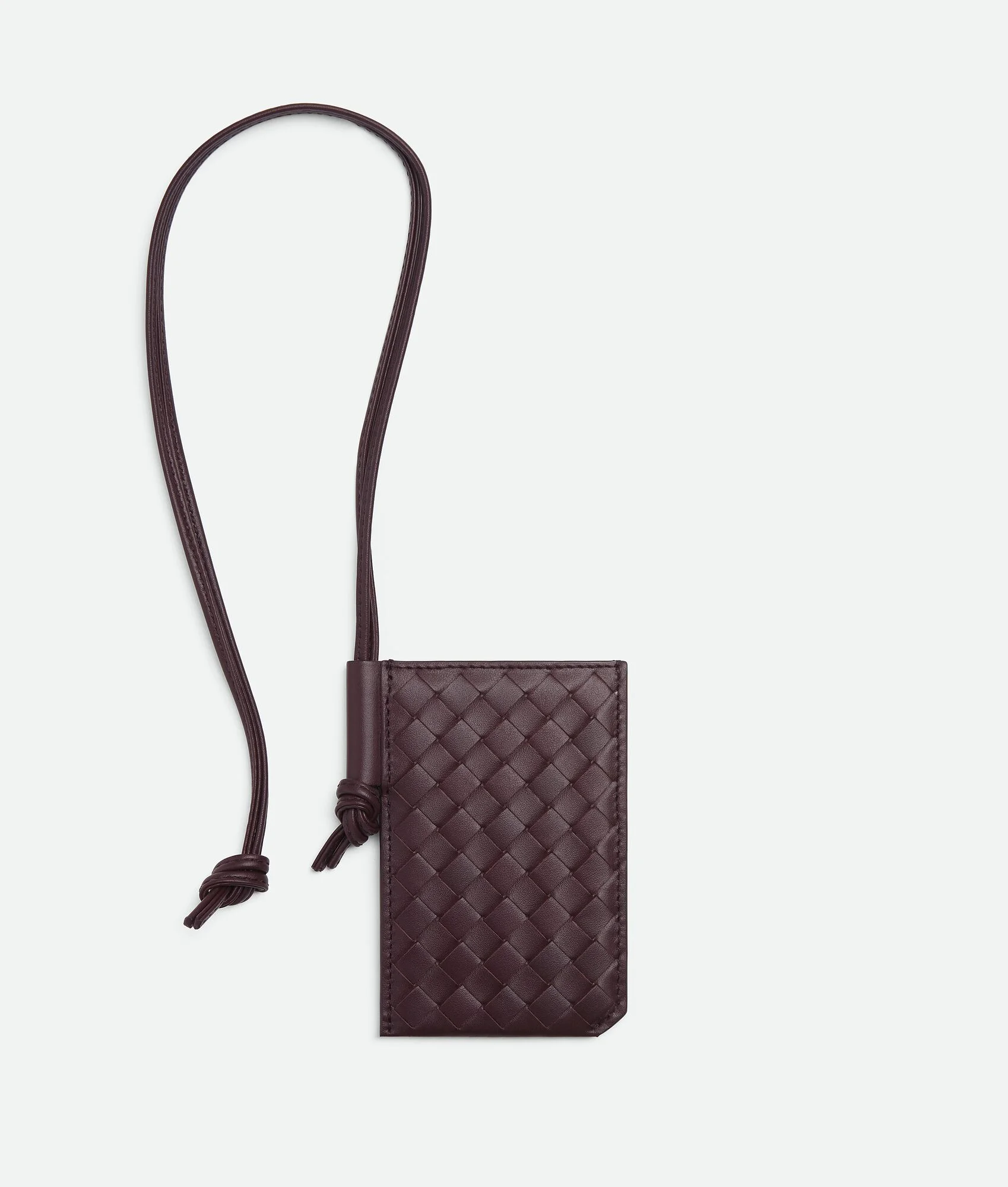 Badge holder in Intrecciato piccolo calf leather. Product Details - Intrecciato piccolo calfskin leather badge holder - One card compartment - Leather lanyard - Our VN Preserve calfskin leather is crafted using the BioBasedLeather® tanning process, which reduces the use of petroleum-based components to less than 3% and is fully powered by renewable energy sources - Lining: Calf leather - Color: Dark Barolo - Made in: Italy - Product code: 827681V4LQ02241 Material - Material: Calfskin Size & Fit - Height: 10.5 cm | 4.1" - Width: 7 cm | 2.8" - Depth: 0.5 cm | 0.2" - Strap Drop: 45 cm | 17.7"