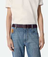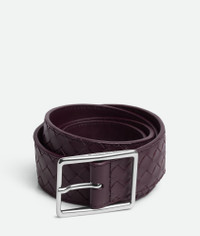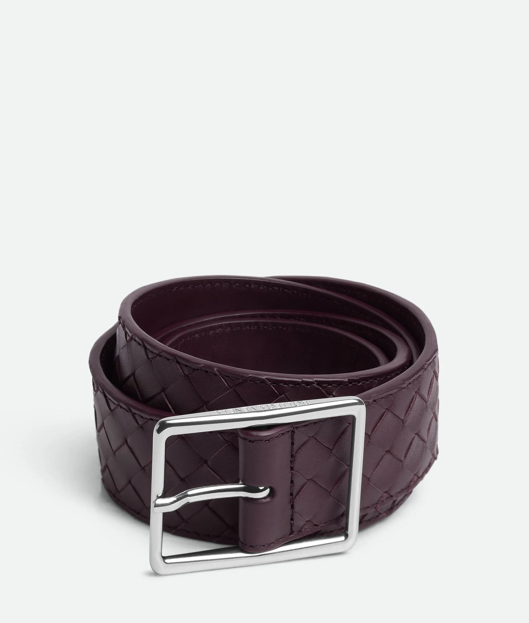 Belt in Intrecciato piccolo calf leather. Product Details - Intrecciato Piccolo calf leather belt - Metal buckle - Prong closure - Our VN Preserve calf leather is realized through the BioBasedLeather® process, which ensures a limited presence of petrol-based components and exclusive reliance on renewable energy sources. - Lining: Calf leather - Color: Dark Barolo - Hardware: Silver finish - Made in: Italy - Product code: 796783V4LQ12263 Material - Material: Calfskin Size & Fit - Height: 3.5 cm | 1.4" - Depth: 0.5 cm | 0.2"