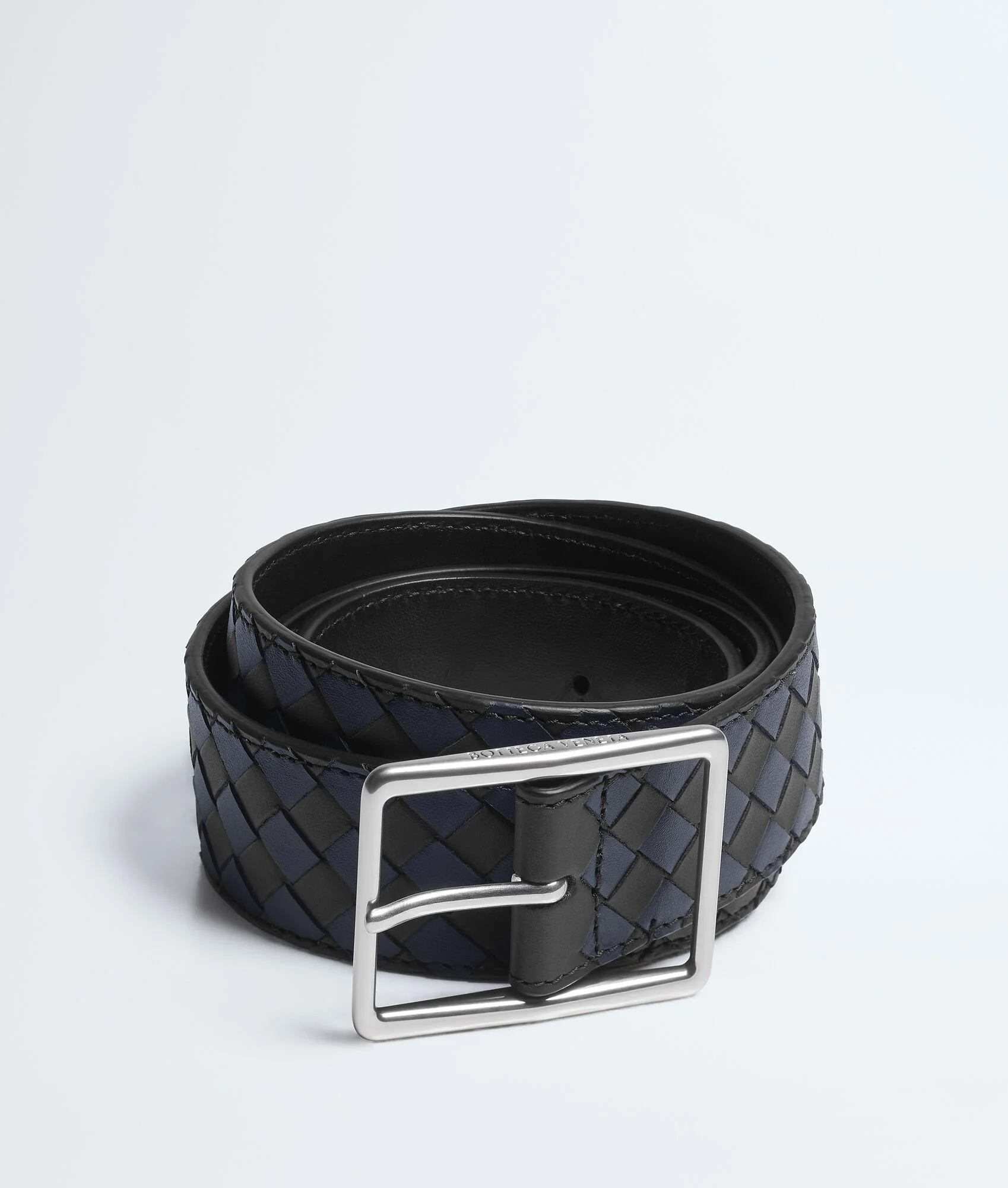 Product Details - Intrecciato piccolo calfskin leather belt with bi-colour check effect - Metal buckle - Prong closure - Lining: Calfskin - Colour: Black/Midnight - Hardware: Silver finish - Made in: Italy - Product code: 796783V5I411148 Material - Material: calfskin Size & Fit - Height: 3.5 cm | 1.4" - Depth: 0.5 cm | 0.2"
