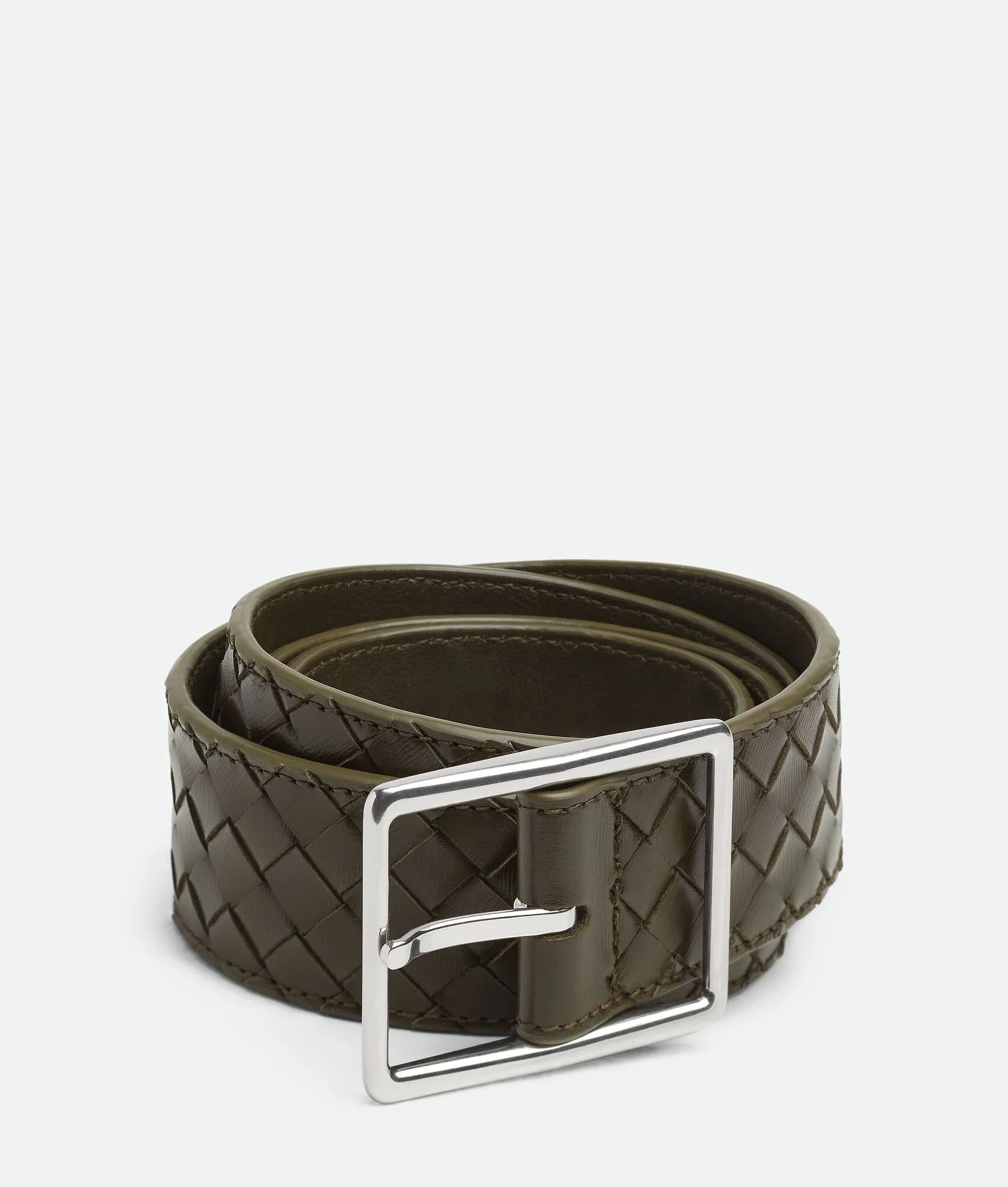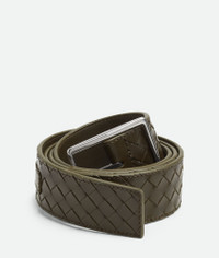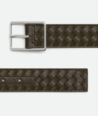 Intrecciato Piccolo calfskin leather belt. Product Details - Buckle closure - Our VN Preserve calfskin leather is crafted using the BioBasedLeather® process, which ensures a limited presence of petrol-based components and exclusive reliance on renewable energy sources. - Material: calfskin - Lining: Calfskin - Color: Kaki - Hardware: Silver finish - Height: 3.5 cm | 1.4" - Depth: 0.5 cm | 0.2" - Made in: Italy - Product code: 796783V4LQ13386