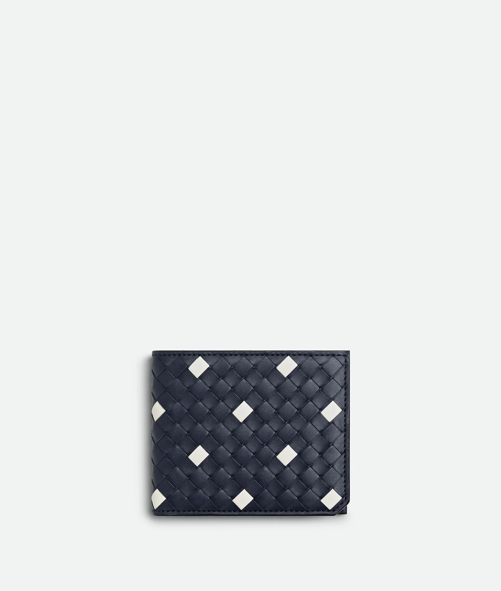 Bi-fold wallet in Intrecciato piccolo calf leather with polka dots. Product Details - Intrecciato piccolo calf leather wallet with polka dots - Eight card slots, two note compartments, two additional pockets - Our VN Preserve calf leather is realized through the BioBasedLeather® process, which ensures a limited presence of petrol-based components and exclusive reliance on renewable energy sources - Lining: Calf leather - Color: Abyss/White - Hardware: Silver finish - Height: 9.5 cm | 3.7" - Width: 11 cm | 4.3" - Depth: 1 cm | 0.4" - Made in: Italy - Product code: 796966V5SJ14144