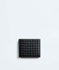 Bi-fold wallet in Intrecciato piccolo calf leather with two-tone checkered effect. Product Details - Intrecciato piccolo calfskin leather wallet with two-tone checkered effect - Eight card slots, one note compartment, two additional pockets - Our VN Preserve calfskin leather is made with the BioBasedLeather® process, which ensures a limited presence of petrol-based components and exclusive reliance on renewable energy sources - Color: Black/Midnight - Lining: Calfskin - Made in: Italy - Product code: 796966V5I411126 Material - Material: calfskin Size & Fit - Height: 9.5 cm | 3.7" - Width: 11 cm | 4.3" - Depth: 0.5 cm | 0.2"