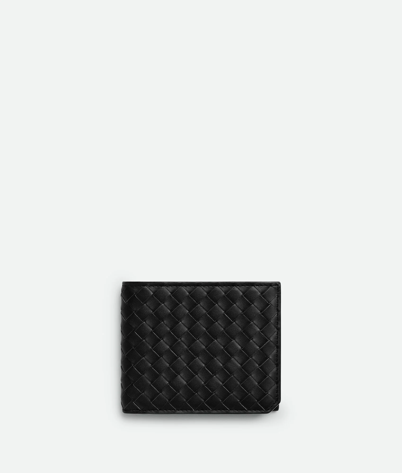 Intrecciato piccolo calfskin leather wallet. Product Details - Eight card slots, one note compartment, two additional pockets - Our VN Preserve calfskin leather is crafted using the BioBasedLeather® process, which ensures a limited presence of petrol-based components and exclusive reliance on renewable energy sources. - Material: calfskin - Lining: Calfskin - Color: Black - Hardware: Silver finish - Height: 9.5 cm | 3.7" - Width: 11 cm | 4.3" - Depth: 0.5 cm | 0.2" - Made in: Italy - Product code: 796966V4LQ28803