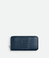 Zip around wallet in Intrecciato piccolo calf leather with smooth leather side details. Product Details - Intrecciato piccolo calfskin leather wallet with smooth sides - Eight card slots, two note compartments, two additional pockets, one zipped coin purse - Zip closure - Our VN Preserve calfskin leather is realized through the BioBasedLeather® process, which ensures a limited presence of petrol-based components and exclusive reliance on renewable energy sources - Lining: Calfskin - Color: Neptune - Hardware: Silver finish - Made in: Italy - Product code: 861796V2BEA4035 Material - Material: Calfskin Size & Fit - Height: 10 cm (3.9") - Width: 19 cm (7.5") - Depth: 2 cm (0.8")