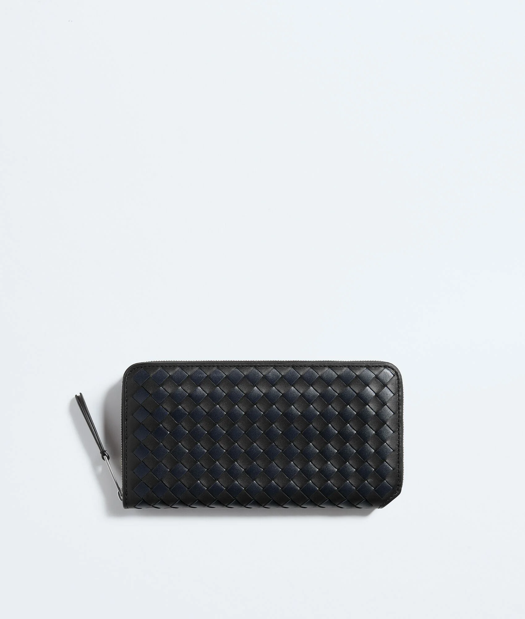 Zip-around wallet in Intrecciato piccolo calf leather with two-tone checkered effect. Product Details - Intrecciato piccolo calfskin leather wallet with two-tone checkered effect - Eight card slots, two note compartments, two additional pockets, one zipped coin purse - Zipper closure - Our VN Preserve calfskin leather is made with the BioBasedLeather® process, which ensures a limited presence of petrol-based components and exclusive reliance on renewable energy sources - Color: Black/Midnight - Hardware: Silver finish - Lining: Calfskin - Made in: Italy - Product code: 814680V5I411148 Material - Material: calfskin Size & Fit - Height: 10 cm | 3.9" - Width: 19 cm | 7.5" - Depth: 2 cm | 0.8"