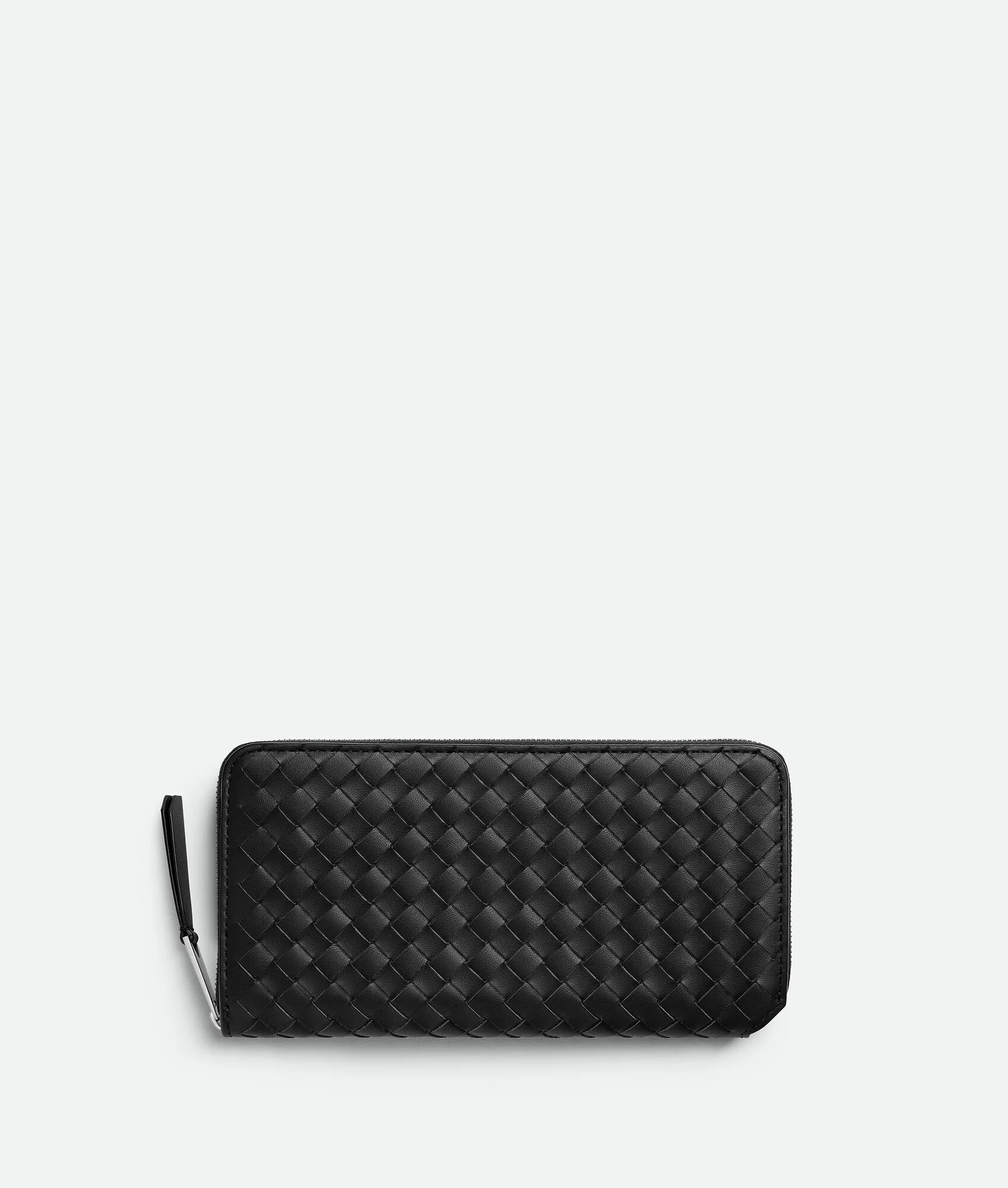 Intrecciato piccolo calfskin leather wallet. Product Details - Eight card slots, two note compartments, two additional pockets, one zipped coin purse - Zip closure - Our VN Preserve calfskin leather is crafted through the BioBasedLeather® process, which ensures a limited presence of petrol-based components and exclusive reliance on renewable energy sources. - Material: calfskin - Lining: Calfskin - Color: Black - Hardware: Silver finish - Height: 10 cm | 3.9" - Width: 19 cm | 7.5" - Depth: 2 cm | 0.8" - Made in: Italy - Product code: 796967V4LQ18803