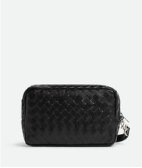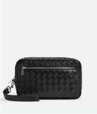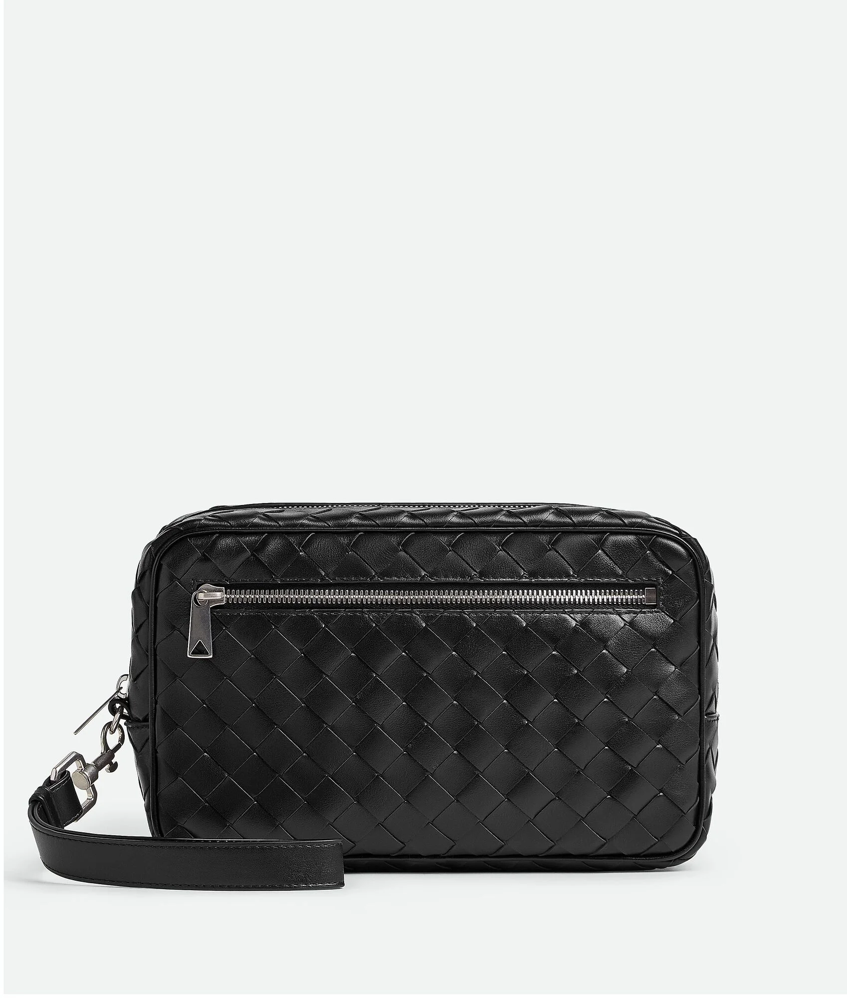Intrecciato calfskin leather pouch with detachable wristlet Product Details - One single compartment, one internal leather panel, six card slots - One exterior zippered pocket - Zipper closure - Material: calfskin - Lining: Canvas - Color: Black - Hardware: Silver finish - Height: 15.5 cm | 6.1" - Width: 25 cm | 9.8" - Depth: 6.5 cm | 2.6" - Made in: Italy - Product code: 777390V2HL18803