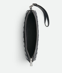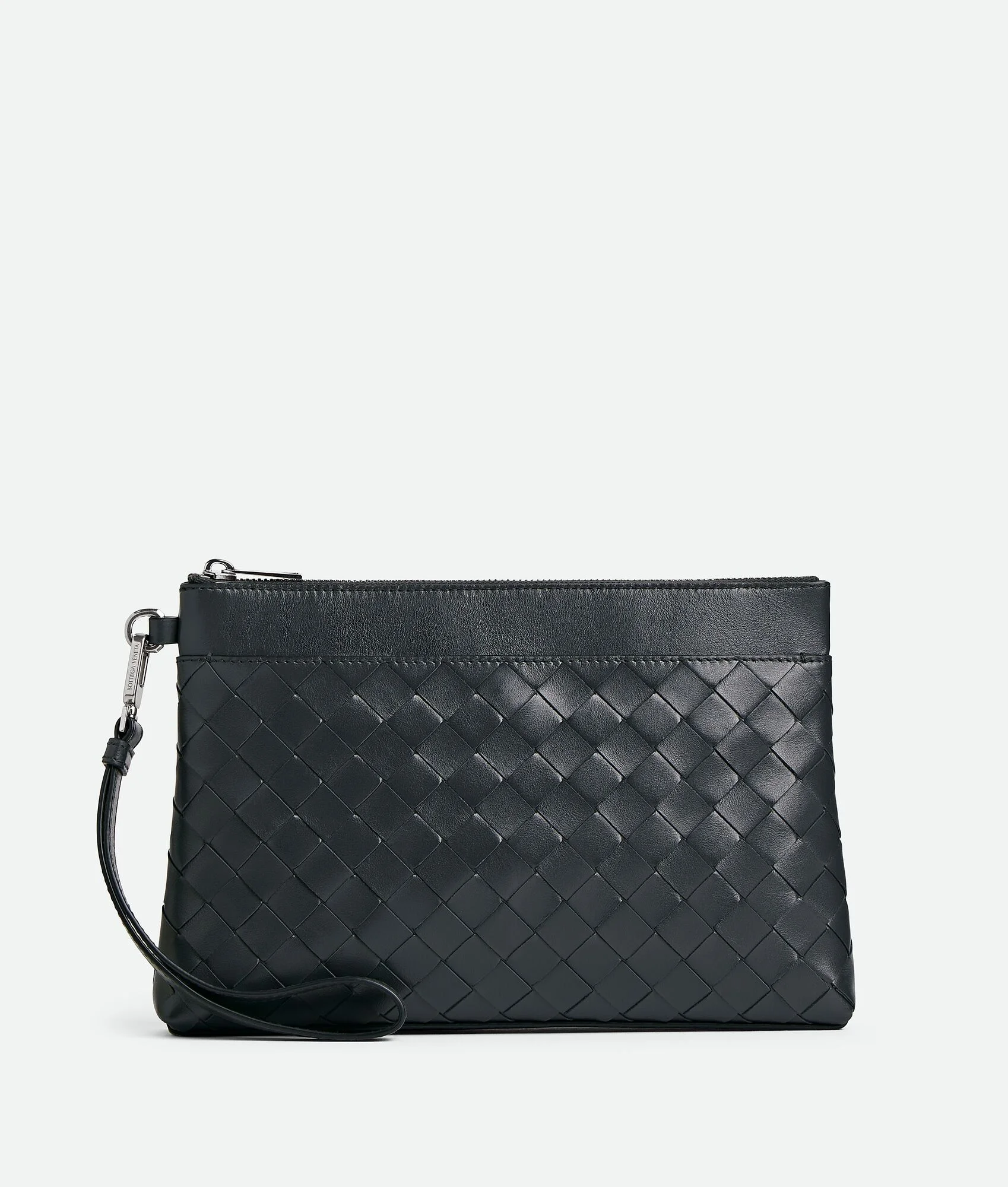 Pouch in Intrecciato calf leather with detachable wristlet. Product Details - Intrecciato calf leather pouch with detachable wristlet - One single compartment, one internal flat leather pocket with six card slots - Single exterior front pocket with magnetic closure - Detachable leather wristlet with a hook - Zipper closure - Material: Calfskin - Lining: Nylon - Color: Ardoise - Hardware: Silver finish - Height: 17 cm | 6.7" - Width: 25 cm | 9.8" - Depth: 4 cm | 1.6" - Handle drop: 17 cm | 6.7" - Made in: Italy - Product code: 795712V2HL12077