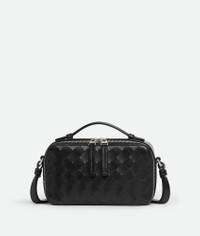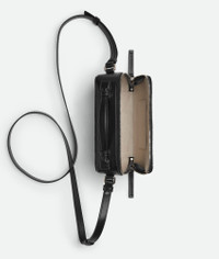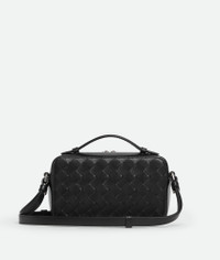 Phone pouch in Intrecciato calf leather with handle and adjustable cross-body strap. Product Details - Intrecciato calfskin leather phone pouch - Handle and adjustable cross-body strap - One main compartment, one flat inside pocket - Zipper closure - Lining: Canvas - Color: Black - Hardware: Silver finish - Made in: Italy - Product code: 844067V2HL08803 Material - Material: Calfskin Size & Fit - Height: 11 cm | 4.3" - Width: 19 cm | 7.5" - Depth: 4.2 cm | 1.8" - Strap drop: 57 cm | 22.4"