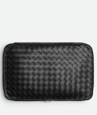 Small Intrecciato calfskin leather packing cube Product Details - Interior leather tag with embossed logo - Zipper closure - Material: Calfskin - Lining: Canvas - Color: Black - Hardware: Silver finish - Height: 5 cm | 2" - Width: 37 cm | 14.6" - Depth: 23 cm | 9.1" - Made in: Italy - Product code: 764718V2HL08803