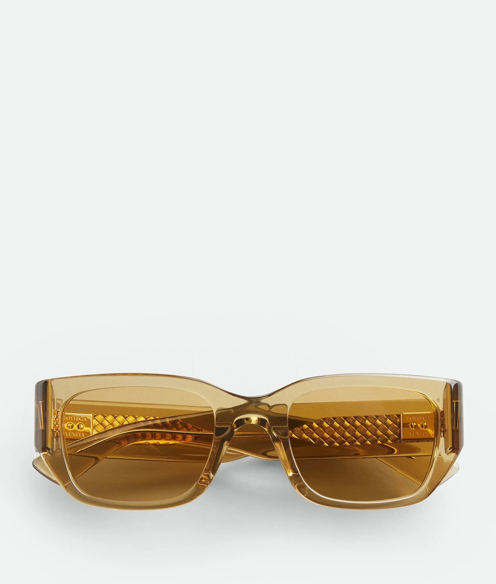 Product Details - Square sunglasses made with Eastman Acetate Renew, an acetate with 27% recycled content - Frame features a gold-finished core wire with a signature Intrecciato pattern - Gold-finished detailing at the temples recalling the Intrecciato weave - Lenses made from polyamide with 39% bio-based content - Lens width: 51 mm | 2"; Bridge length: 22 mm | 0.9"; Temple length: 140 mm | 5.5" - BV1400S 004 - Color: Yellow/Brown - Made in: Japan - Product code: 841186V2Q307410 Material - Material: Recycled acetate