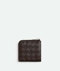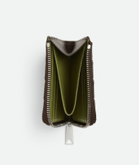 Intrecciato calfskin leather wallet with contrasted interior. Product Details - Four interior card slots, one central coin purse, one divider to fold and organize bills - Zip closure - Material: Calfskin - Lining: Calfskin - Colour: Fondant/Matcha - Hardware: Silver finish - Height: 10 cm | 3.9” - Width: 10 cm | 3.9” - Depth: 1.5 cm | 0.6” - Made in: Italy - Product code: 817741VCPQ52126