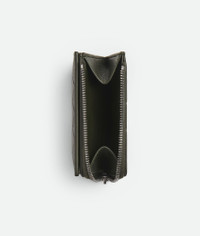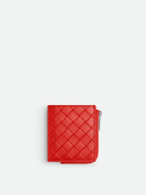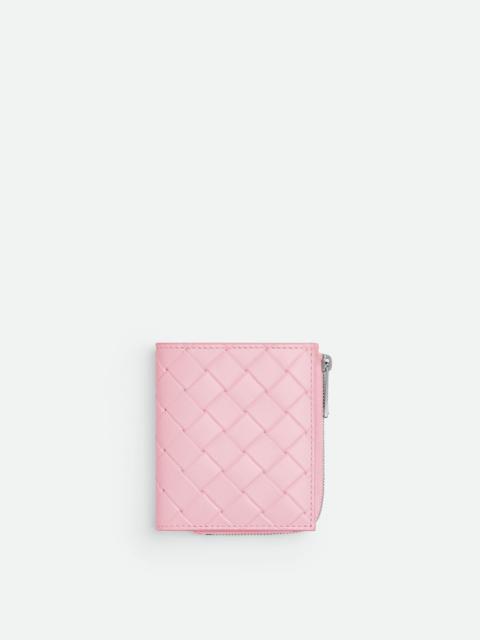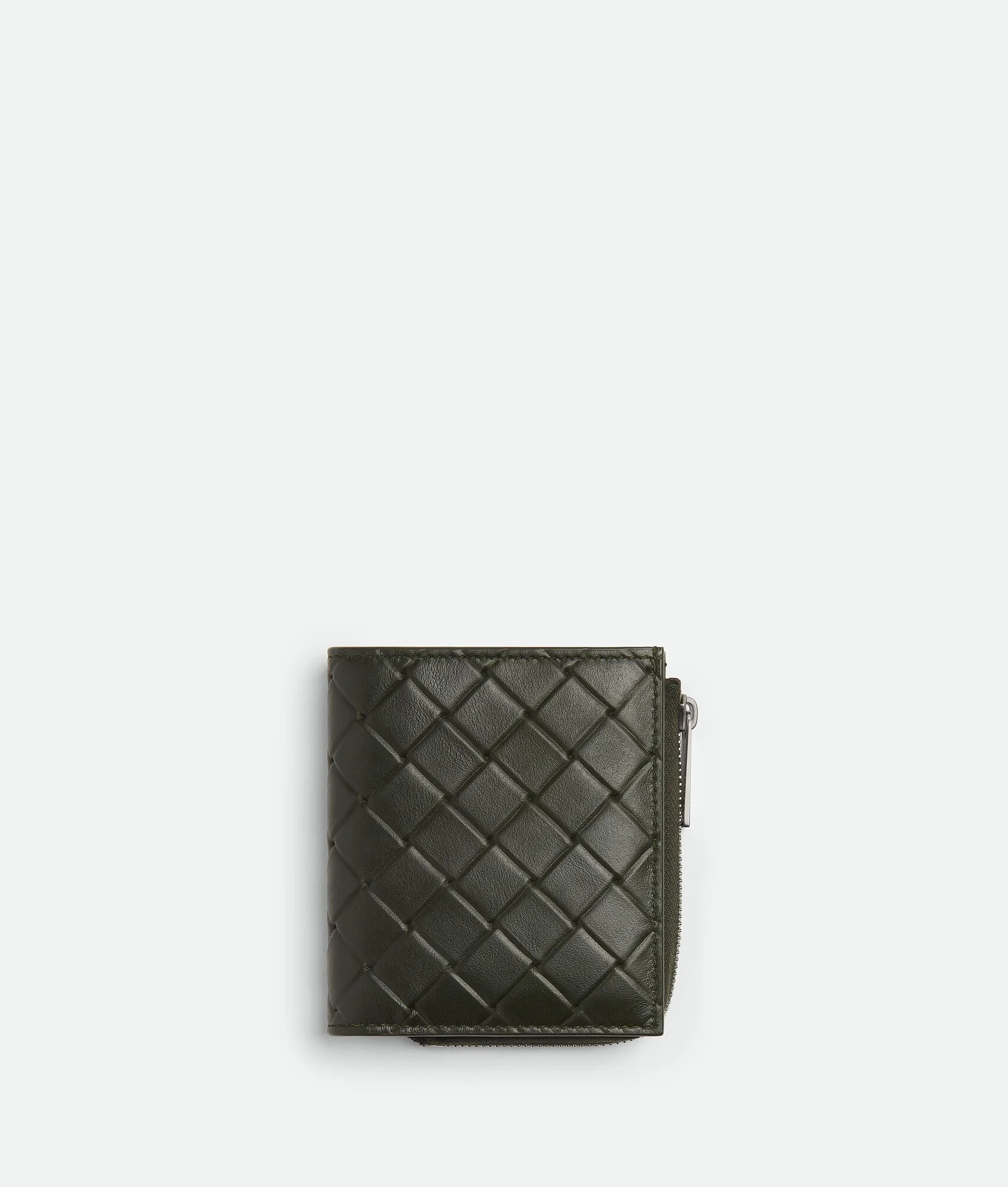 Bi-fold wallet in calf leather with embossed Intrecciato pattern. Product Details - Intrecciato embossed calf leather wallet - Six card slots, one bill compartment, one zippered coin purse - Press-stud closure - Lining: Calf leather - Color: Camping - Hardware: Silver finish - Made in: Italy - Product code: 841823V0AQ13203 Material - Material: Calfskin Size & Fit - Height: 10 cm | 3.9" - Width: 9 cm | 3.5" - Depth: 2 cm | 0.8"