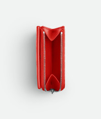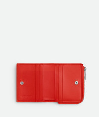 Zipped bi-fold wallet in calf leather with embossed Intrecciato pattern. Product Details - Intrecciato embossed calf leather wallet - Six card slots, one bill compartment, one zippered coin purse - Press stud closure - Lining: Calf leather - Color: Cherry Tomato - Height: 10 cm | 3.9" - Width: 9 cm | 3.5" - Depth: 2 cm | 0.8" - Made in: Italy - Product code: 841823V0AQ16530