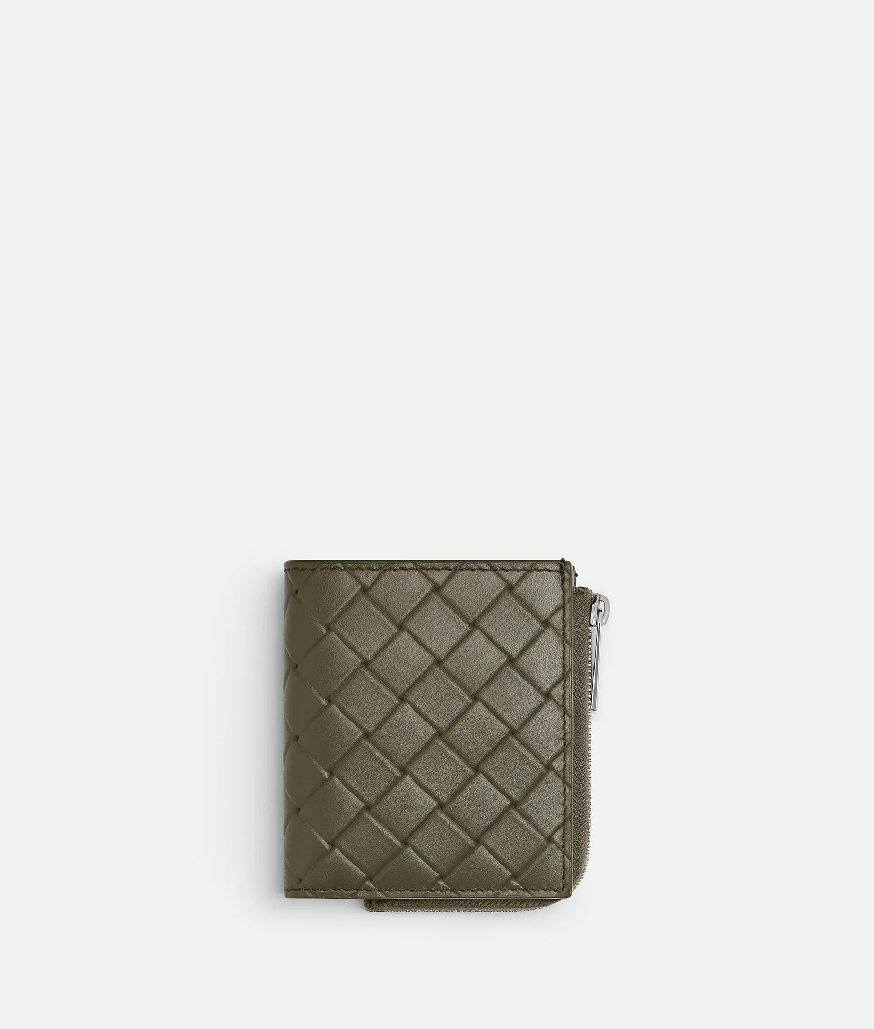 Zipped bi-fold wallet in calf leather with embossed Intrecciato pattern. Product Details - Intrecciato embossed calf leather wallet - Six card slots, one bill compartment, one zippered coin purse - Press stud closure - Lining: Calf leather - Color: Cypress - Height: 10 cm | 3.9" - Width: 9 cm | 3.5" - Depth: 2 cm | 0.8" - Made in: Italy - Product code: 841823V0AQ13227