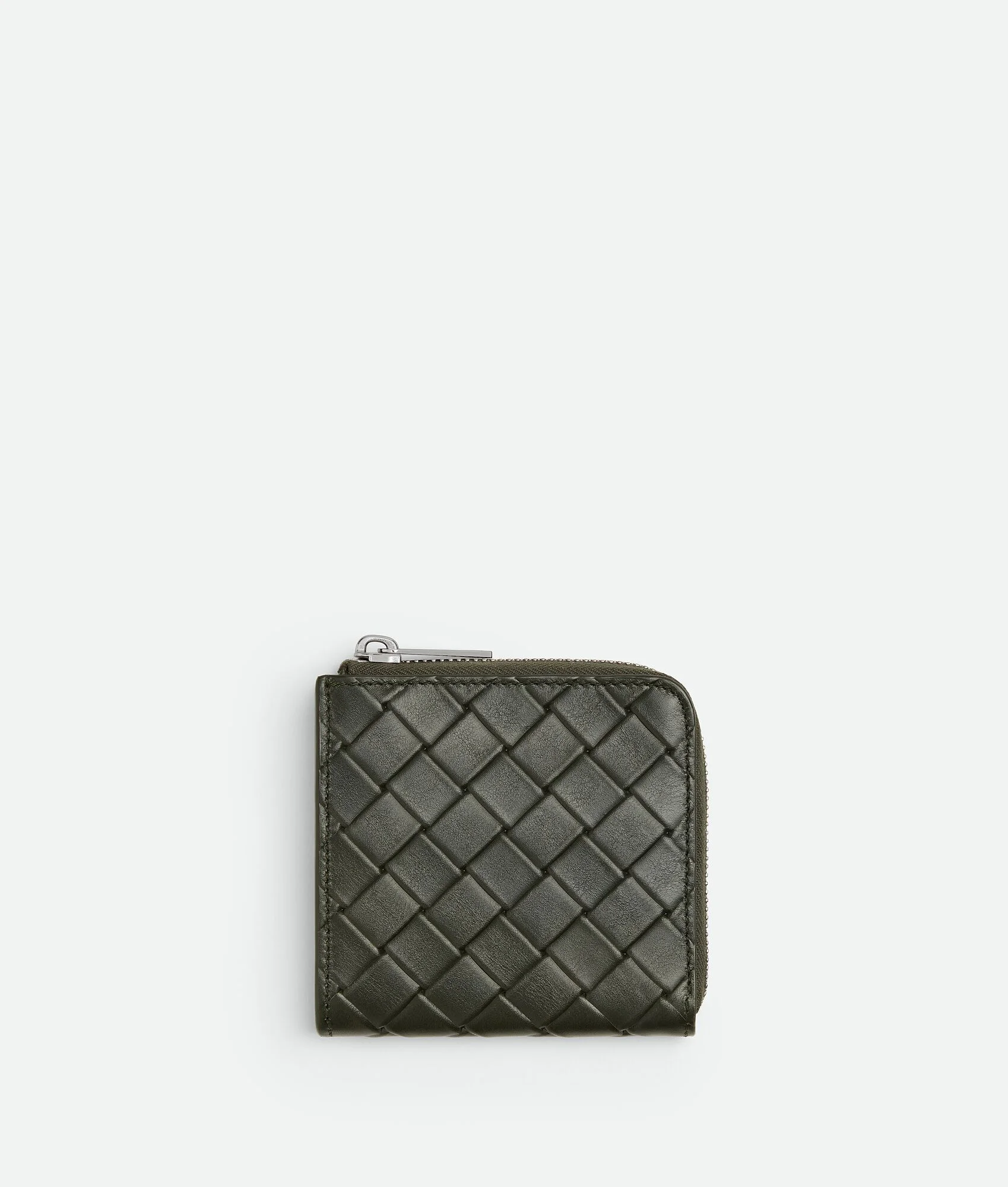Square zip around wallet in calf leather with embossed Intrecciato pattern. Product Details - Intrecciato embossed calf leather wallet - Four interior card slots, one central coin purse, one divider to fold and organize bills - Zipper closure - Lining: Calf leather - Color: Camping - Hardware: Silver finish - Made in: Italy - Product code: 817741V0AQ13203 Material - Material: Calfskin Size & Fit - Height: 10 cm | 3.9" - Width: 10 cm | 3.9" - Depth: 1.5 cm | 0.6"