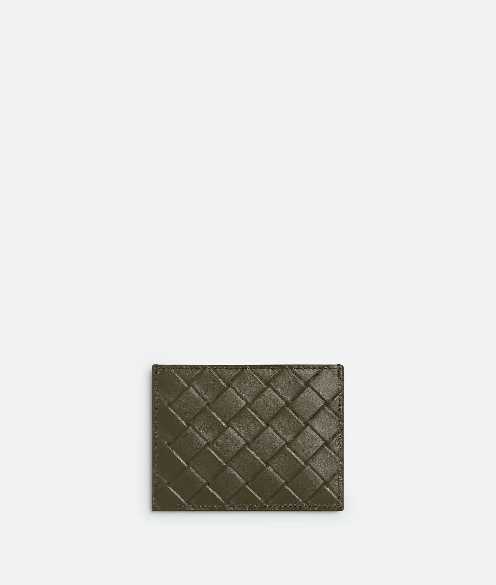 Credit card case in calf leather with embossed Intrecciato pattern. Product Details - Intrecciato embossed calf leather card case - Three card slots, one central pocket - Lining: Calf leather - Color: Cypress - Height: 8 cm | 3.1" - Width: 10.5 cm | 4.1" - Depth: 0.5 cm | 0.2" - Made in: Italy - Product code: 827765V0AQ13227