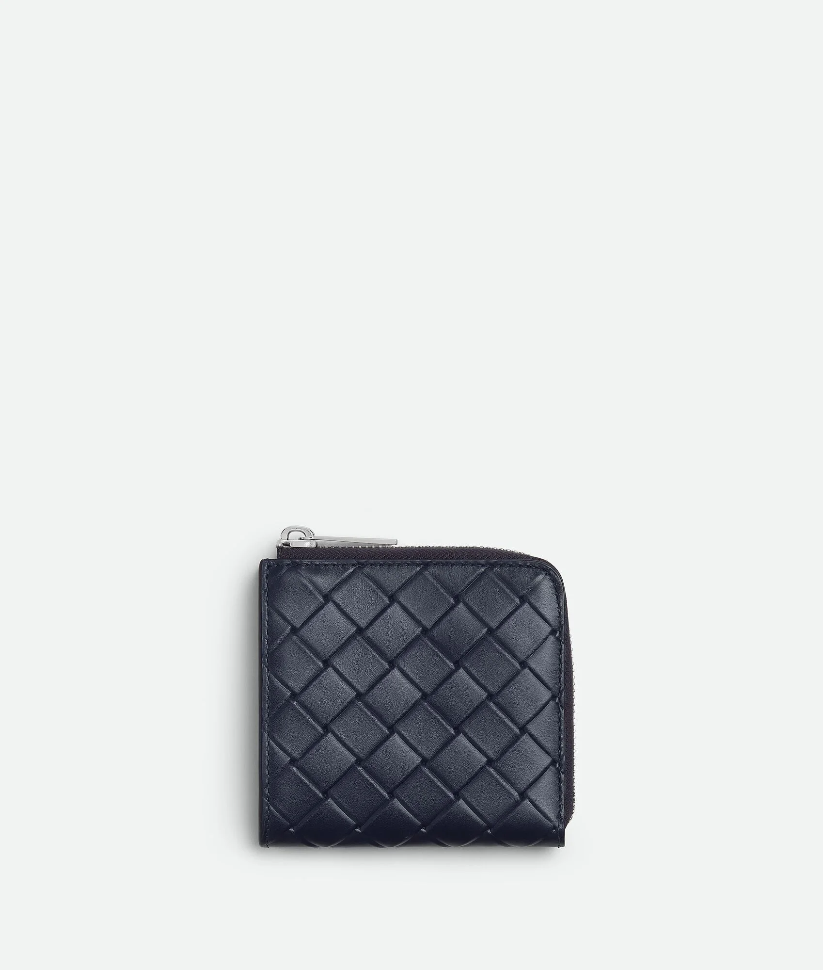 Intrecciato embossed calfskin leather wallet. Product Details - Four interior card slots, one central coin purse, one divider to fold and organize bills - Zip closure - Material: Calfskin - Lining: Calfskin - Colour: Abyss - Hardware: Silver finish - Height: 10 cm | 3.9” - Width: 10 cm | 3.9” - Depth: 1.5 cm | 0.6” - Made in: Italy - Product code: 817741V0AQ14152