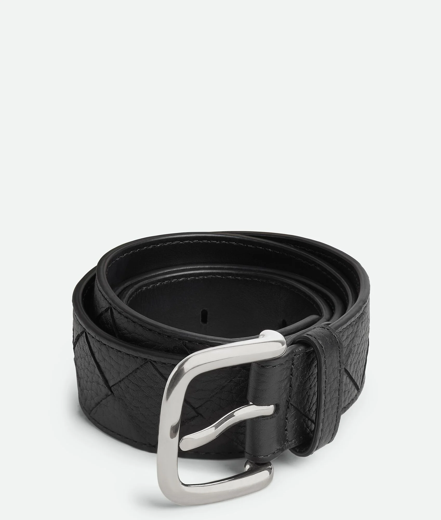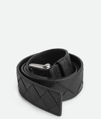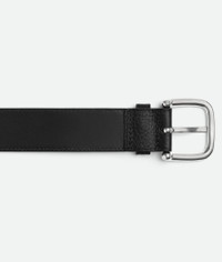 Intrecciato grained calfskin leather belt. Product Details - Buckle closure - Material: Calfskin - Lining: Calfskin - Color: Black - Hardware: Silver finish - Height: 3.5 cm | 1.4" - Depth: 0.5 cm | 0.2" - Made in: Italy - Product code: 829228V5I518803