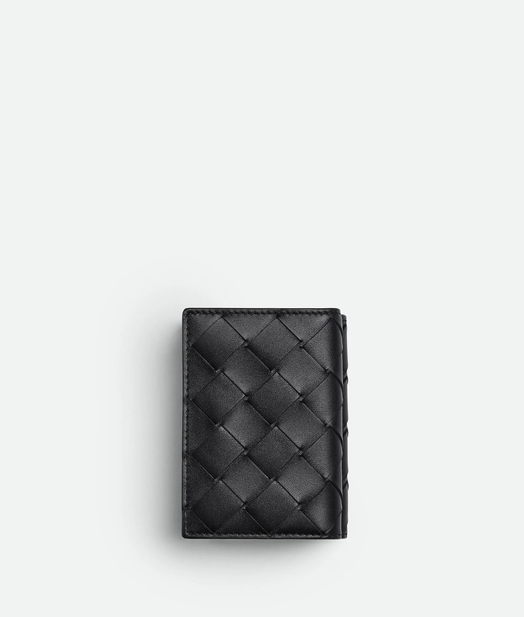 Intrecciato leather wallet. Product Details - Intrecciato leather wallet - Three card slots, one bill compartment, one coin purse - Press stud closure - Material: calfskin - Lining: Calfskin - Color: Black - Hardware: Silver finish - Height: 7 cm - Width: 9.5 cm - Depth: 2.5 cm - Made in: Italy - Product code: 751145VCPQ48803