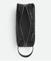 Intrecciato leather pouch with handle. Product Details - Intrecciato leather pouch with handle - One interior zipped pocket, one open pocket - Zip closure - Material: Calfskin - Lining: Nylon - Color: Black - Hardware: Silver finish - Height: 13 cm | 5.1" - Width: 26 cm | 10.2" - Depth: 10 cm | 3.9" - Handle drop: 7 cm | 2.8" - Made in: Italy - Product code: 729295VCPQ18803