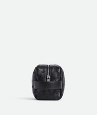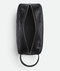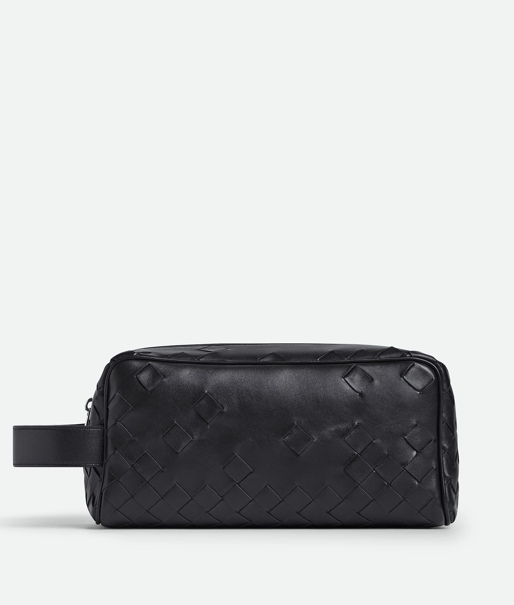 Product Details - Archive Intrecciato silky calfskin leather pouch with handle and all-over degrade effect - One interior zipped pocket, one open pocket - Zipper closure - Lining: Nylon - Color: Black - Hardware: Silver finish - Made in: Italy - Product code: 729295V5XD08803 Material - Material: Calfskin Size & Fit - Height: 13 cm | 5.1" - Width: 26 cm | 10.2" - Depth: 10 cm | 3.9" - Handle drop: 7 cm | 2.8"
