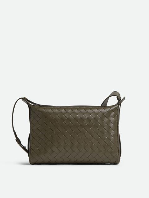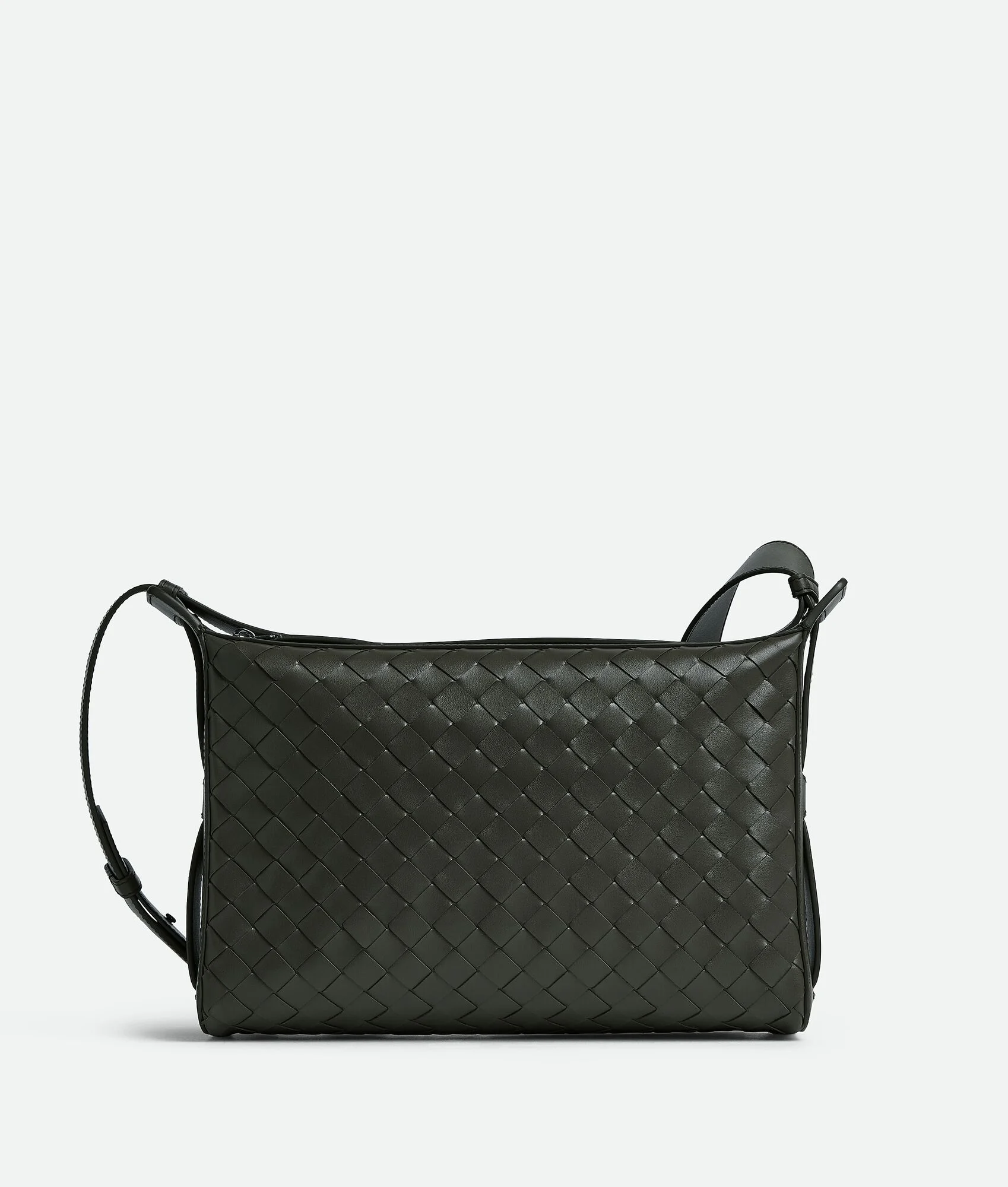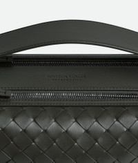 Cross-body bag in Intrecciato leather feautring a collapsible top handle. Product Details - Intrecciato leather cross-body bag with collapsible top handle - Two zipped compartments, with one interior zipped pocket and two flat open pockets - Zip closure - Lining: Canvas - Color: Dark green - Hardware: Silver finish - Made in: Italy - Product code: 836016V2HL13009 Material - Material: Calfskin Size & Fit - Height: 20 cm (7.9") - Width: 30.5 cm (12.0") - Depth: 9 cm (3.5") - Handle drop: 9 cm (3.5") - Strap drop: 52 cm (20.5") >