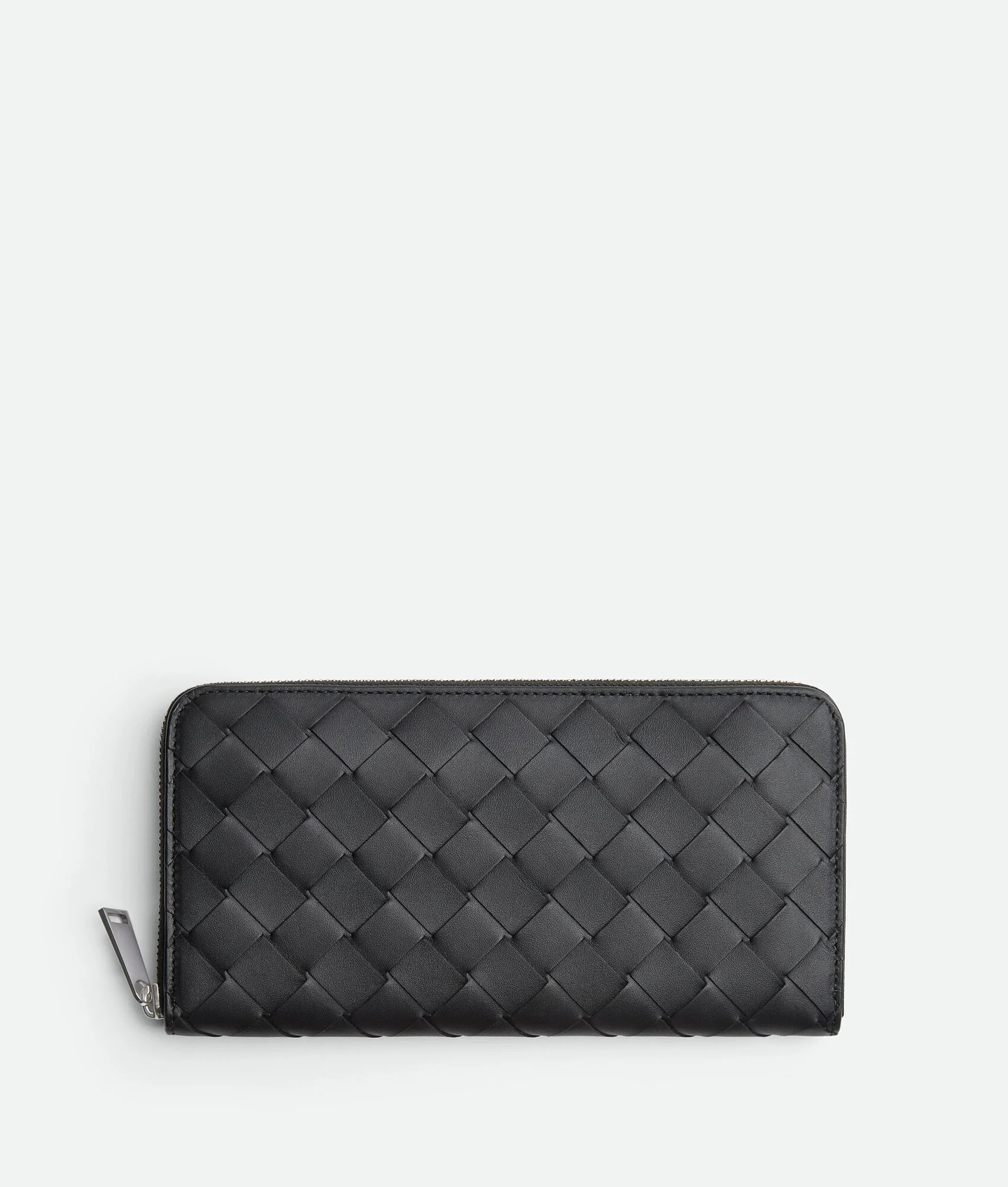 Intrecciato leather wallet. Make it unique with a handmade customization by Product Details - Intrecciato leather wallet - Eight card slots, two bill compartments, two additional pockets, one zipped coin purse - Zipped closure - Material: calfskin - Lining: Calfskin - Color: Black/Grass - Hardware: Silver finish - Height: 10 cm - Width: 19 cm - Depth: 2 cm - Made in: Italy - Product code: 814838VCPQ61027