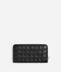 Zip around wallet in contrasted Intrecciato smooth and grainy calf leather. Product Details - Intrecciato calfskin leather wallet - Eight card slots, two note compartments, two additional pockets, one zipped coin purse - Zip closure - Lining: Calfskin - Color: Black - Hardware: Silver finish - Made in: Italy - Product code: 814838V63U18803 Material - Material: Calfskin Size & Fit - Height: 10 cm (3.9") - Width: 19 cm (7.5") - Depth: 2 cm (0.8")