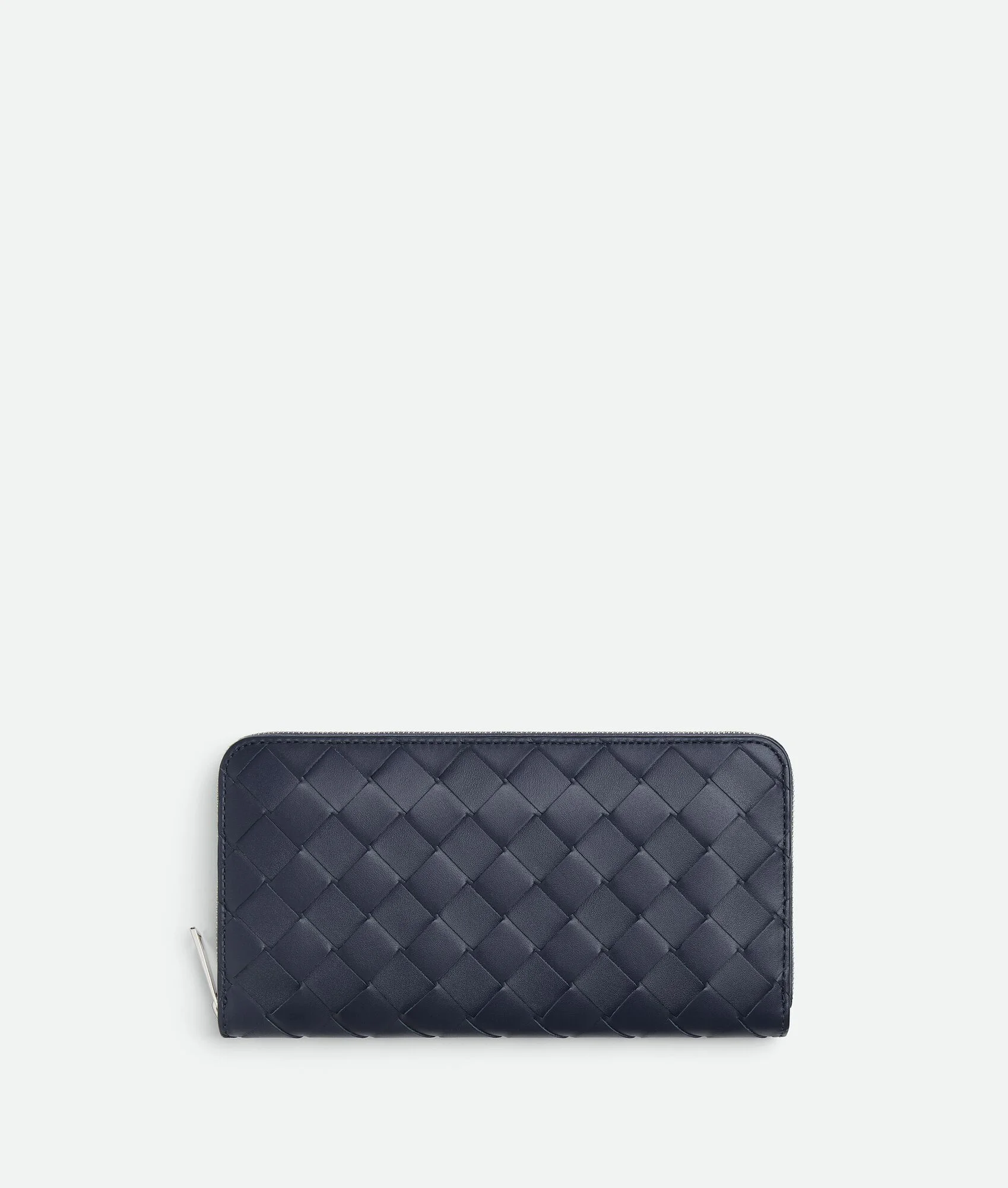 Zip around wallet in Intrecciato calf leather with contrasted interior. Product Details - Intrecciato calf leather wallet with contrasted interior - Eight card slots, two note compartments, two additional pockets, one zipped coin purse - Zipper closure - Material: Calfskin - Lining: Calf leather - Color: Abyss/Cypress - Hardware: Silver finish - Height: 10 cm | 3.9" - Width: 19 cm | 7.5" - Depth: 2 cm | 0.8" - Made in: Italy - Product code: 814838VCPQ63258