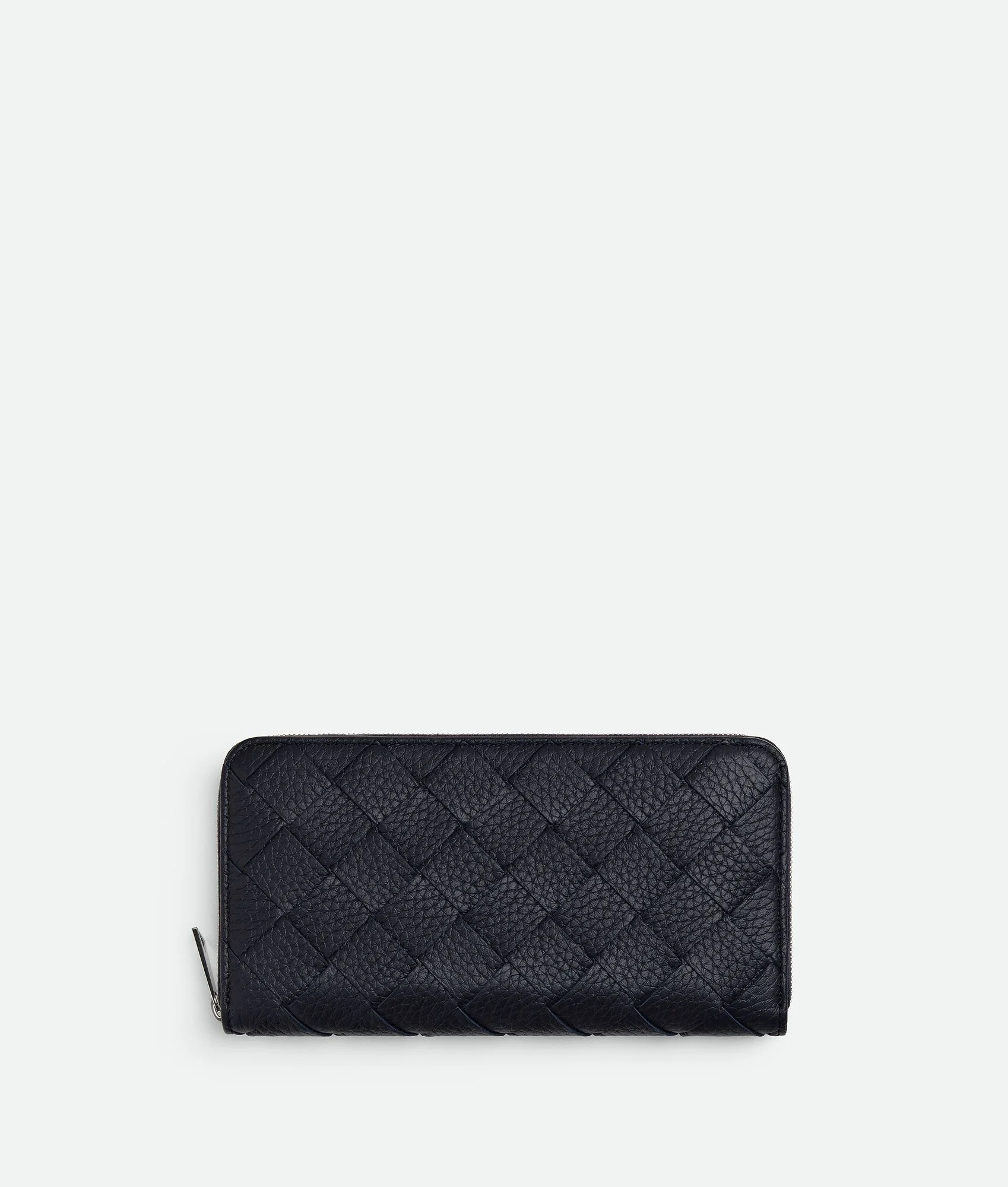 Zip around wallet in grained Intrecciato calf leather. Product Details - Grained Intrecciato calfskin leather wallet. - Eight card slots, two note compartments, two additional pockets, one zipped coin purse - Zipper closure - Lining: Calf leather - Color: Nocturnal - Made in: Italy - Product code: 814838V5I514182 Material - Material: Calfskin Size & Fit - Height: 10 cm | 3.9" - Width: 19 cm | 7.5" - Depth: 2 cm | 0.8"