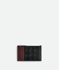 Intrecciato calfskin leather card case with contrasted interior. Product Details - Six card slots, one zippered coin purse - Zipper closure - Material: calfskin - Lining: Calfskin - Color: Black/Madder Brown - Hardware: Silver finish - Height: 7.5 cm | 2.9” - Width: 13 cm | 5.1” - Depth: 0.5 cm | 0.2” - Made in: Italy - Product code: 814706VCPQ51226