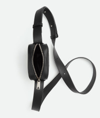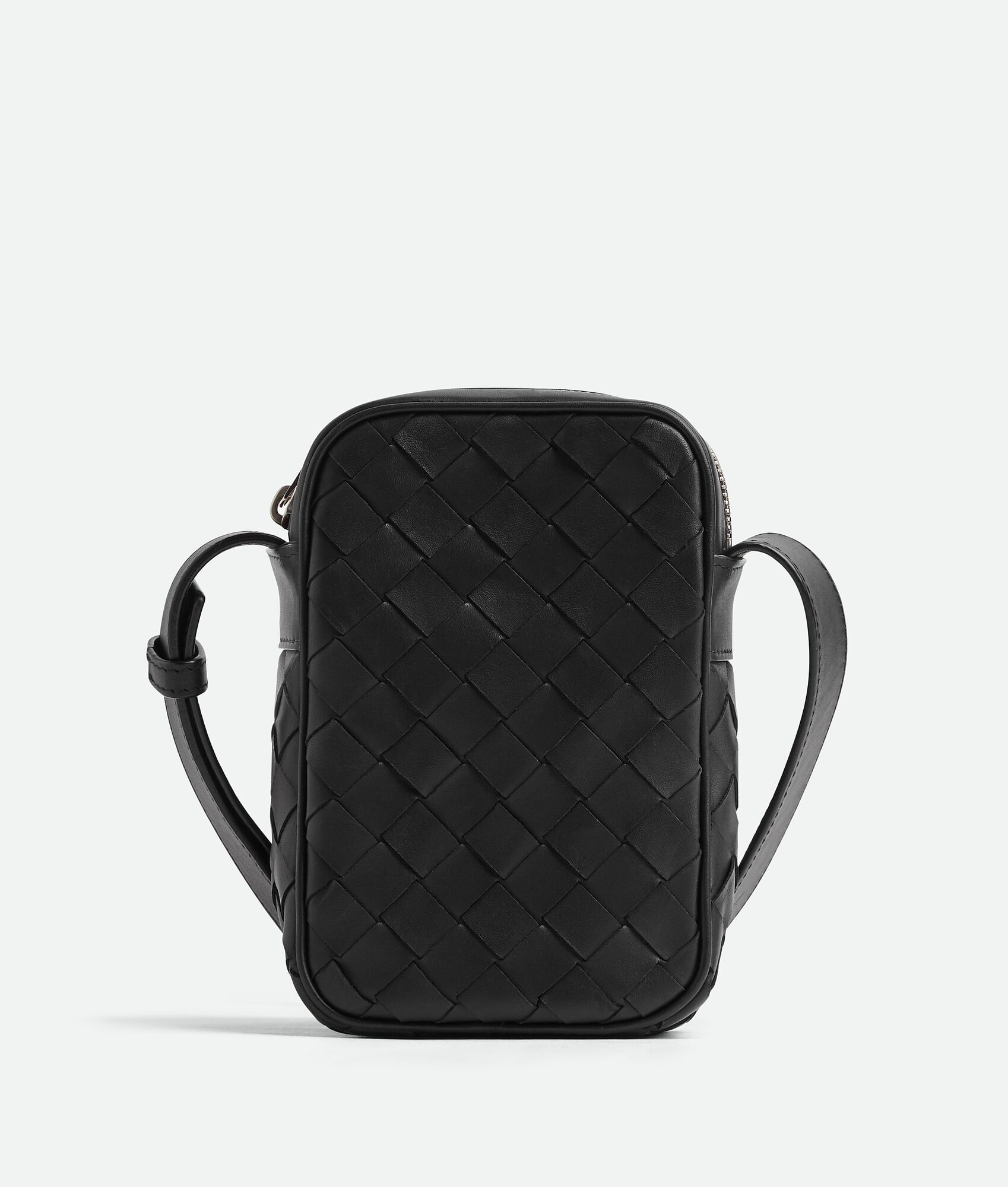 Intrecciato leather cross-body pouch. Product details • Intrecciato leather cross-body pouch • Three interior card slots • Zipper closure Material: 100% Calfskin • Lining: Calfskin • Color: Black • Hardware: Silver finish • Height: 17 cm | 6.7" • Width: 11 cm | 4.3" • Depth: 5 cm | 2" • Strap drop: 55 cm | 21.7" Made in: Italy