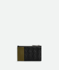Intrecciato calfskin leather card case with contrasted interior. Product Details - Six card slots, one zippered coin purse - Material: calfskin - Lining: Calfskin - Color: Shadow/Olive Oil - Height: 7.5 cm | 3" - Width: 11.5 cm | 4.5" - Depth: 0.5 cm | 0.2” - Made in: Italy - Product code: 755985VCPQ54219