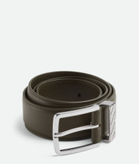 Smooth calfskin leather belt with Intreccio pattern metallic loop. Product Details - Metallic loop with Intrecciato signature - Buckle closure - Material: Calfskin - Lining: Calfskin - Color: Kaki - Hardware: Silver finish - Height: 3.5 cm | 1.4" - Depth: 0.5 cm | 0.2" - Made in: Italy - Product code: 793876VALKO3386