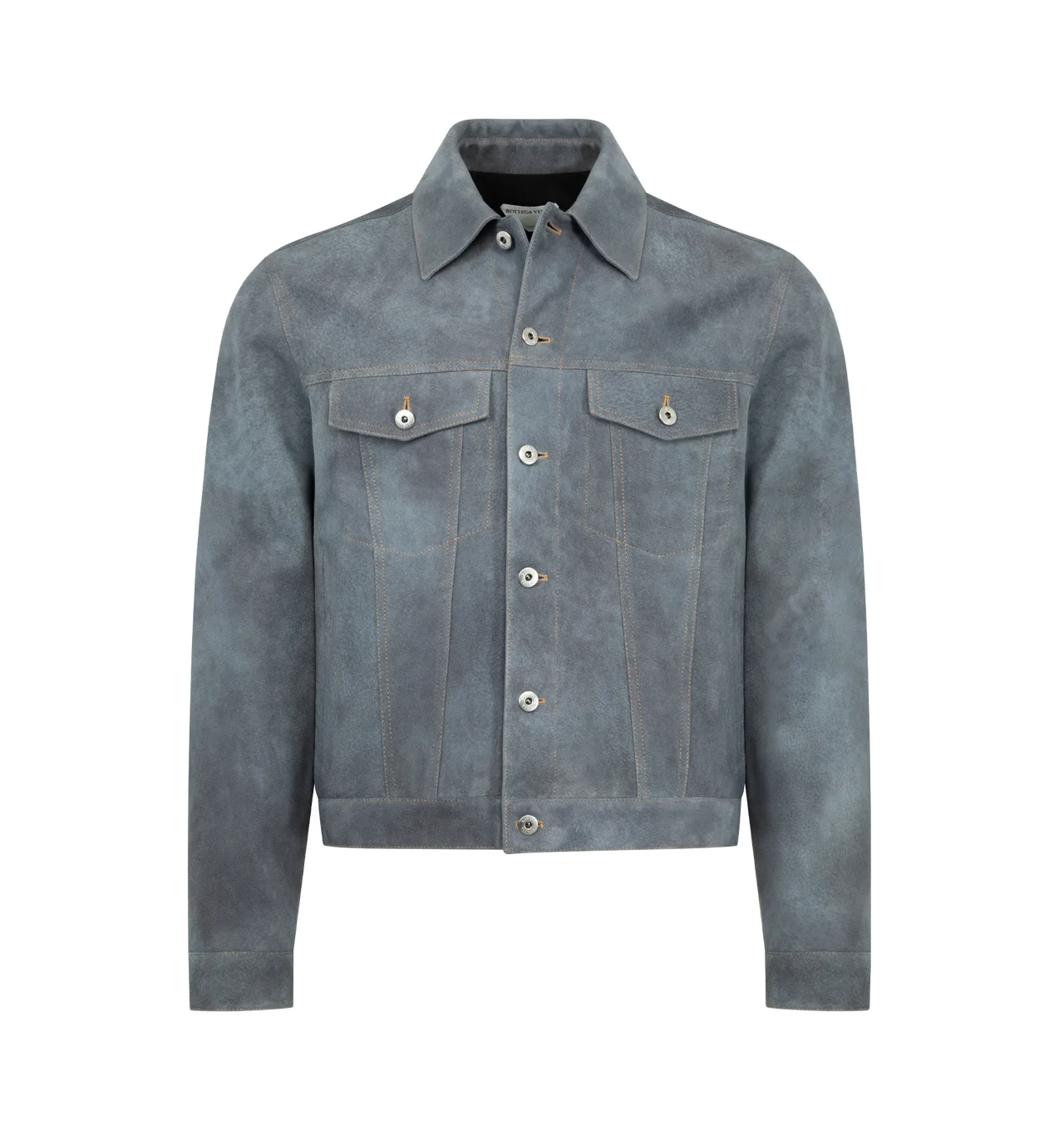BOTTEGA VENETA Jacket featuring a cloudy finish, button closure, front flap button pockets, button cuffs and collar. Made in Italy. DESIGNER STYLE ID: 864553-V66X0 COLOR: 4690 CLOUDY INDIGO