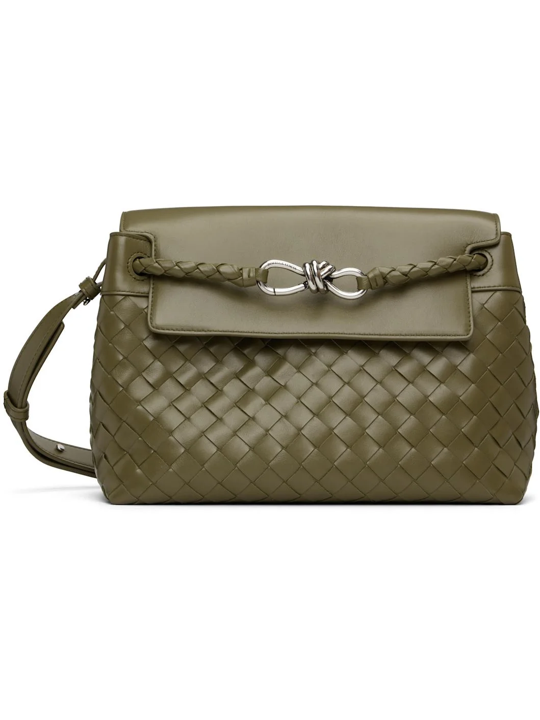 Intrecciato-woven calfskin messenger bag. · Detachable crossbody strap · Strap with graphic hardware at face · Tab-slot flap · Zip and patch pocket at interior · Canvas lining · H9" x W12" x D5" Supplier color: Algae/Vintage silver Calfskin. Made in Italy 251798M170037